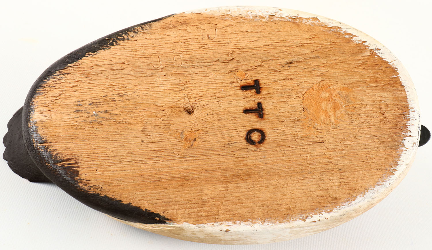 Goldeneye Drake by unknown maker, glass eyes, structurally excellent, solid wood, excellent original paint, has branded JC and TTO on bottom. Grade: Excellent - Value: 40 to 150
