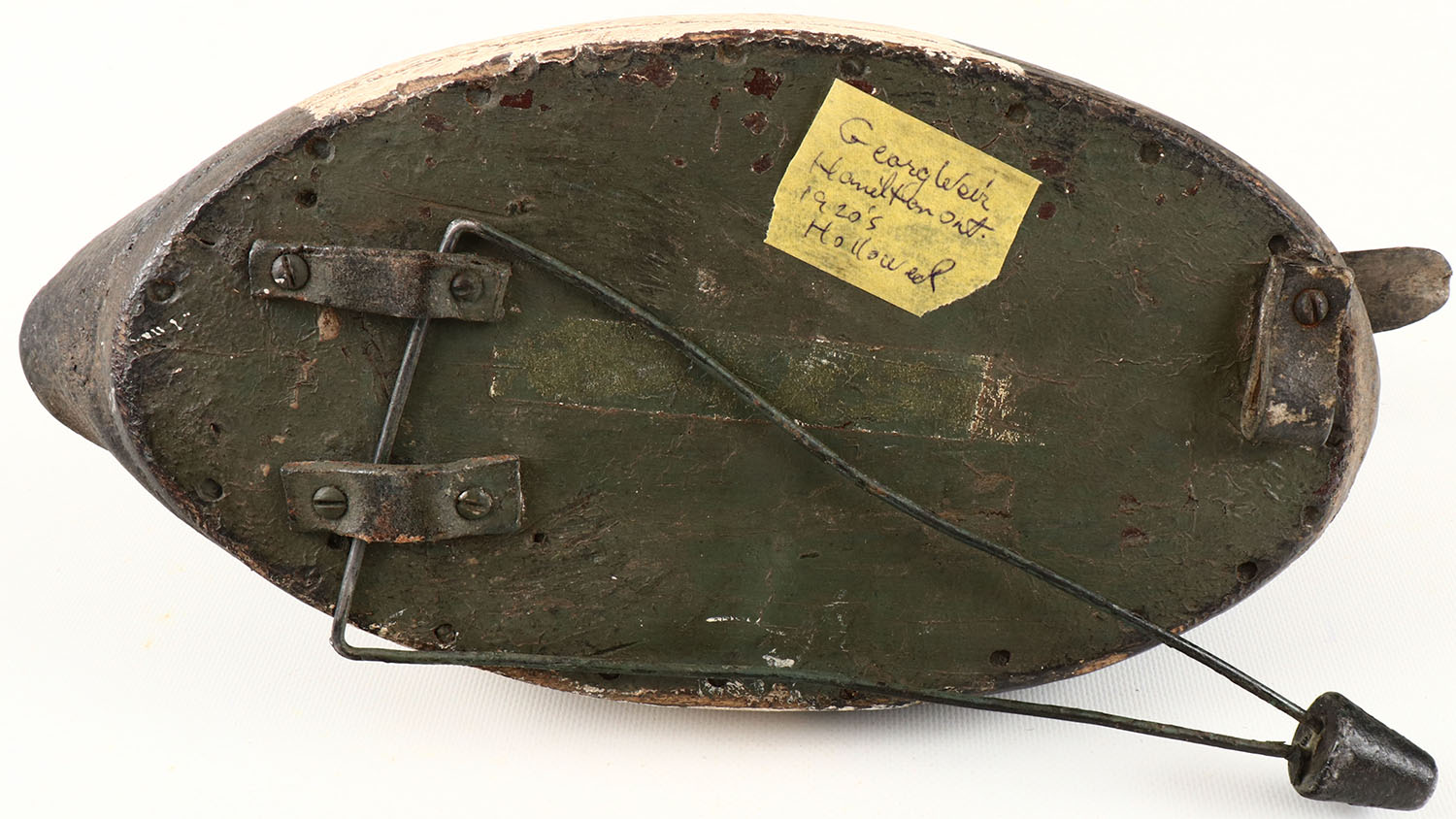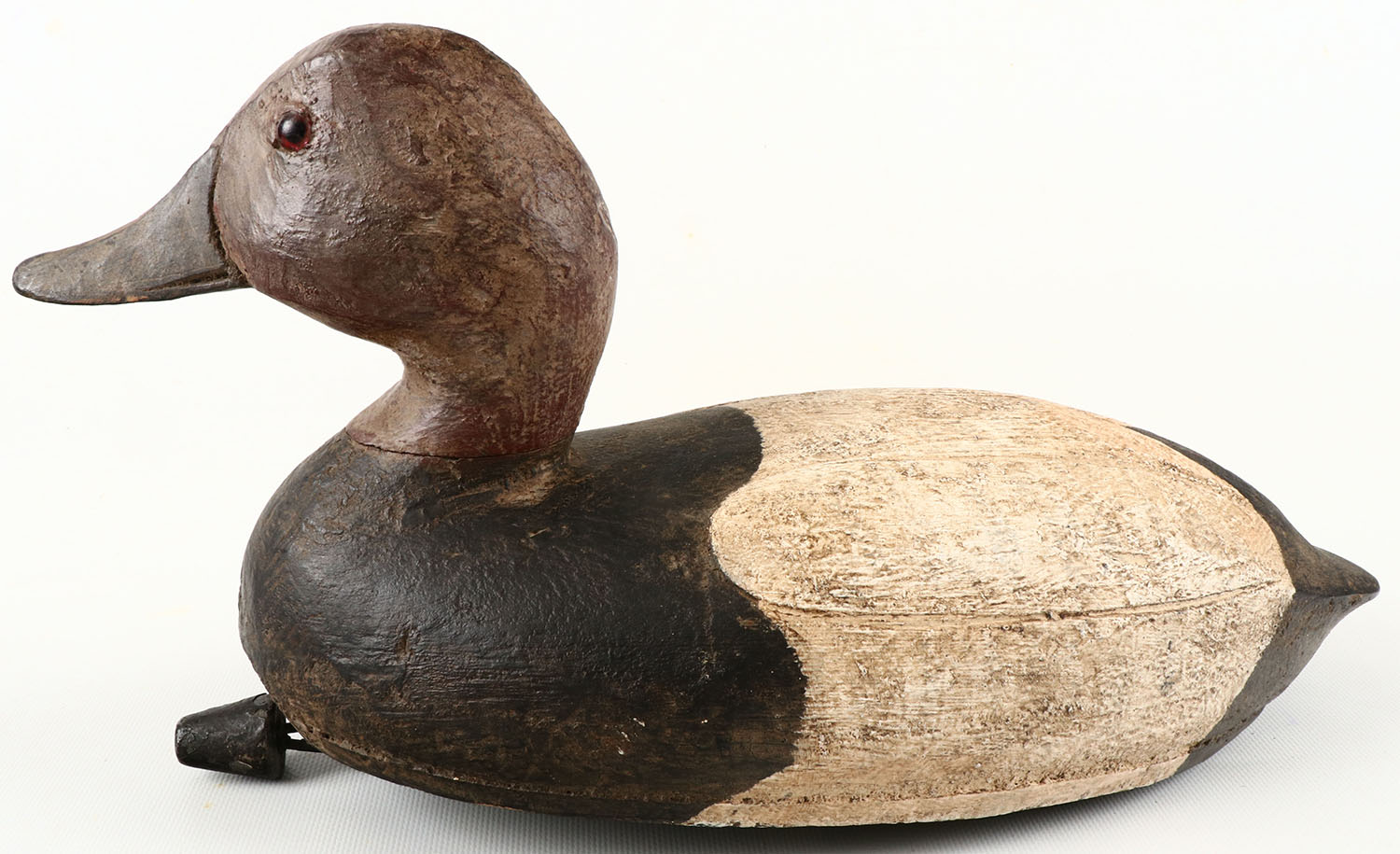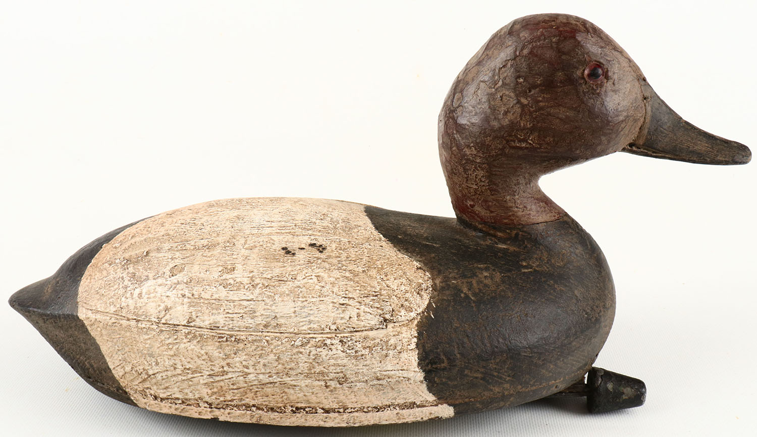 Canvasback Drake by Georg Weir, Hamilton, Ontario (1920s), glass eyes, structurally excellent, hollow wood, has swing ballast weight, excellent paint. Grade: Excellent - Value: 50 to 150