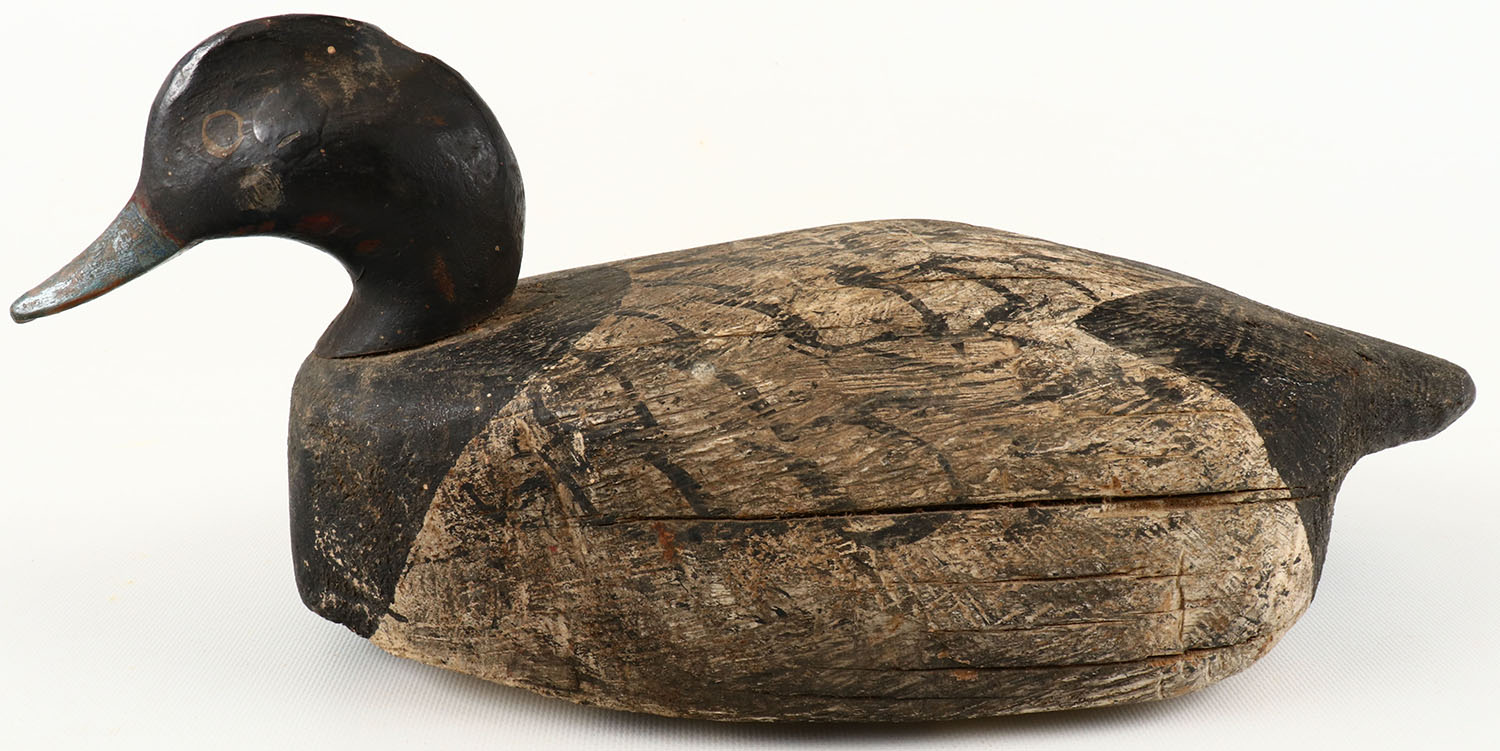 Bluebill Drake by unknown maker, painted eyes, solid wood, has hairline cracks on sides and on bottom, excellent original paint with typical wear. Grade: Very Good ++ - Value: 40 to 150
