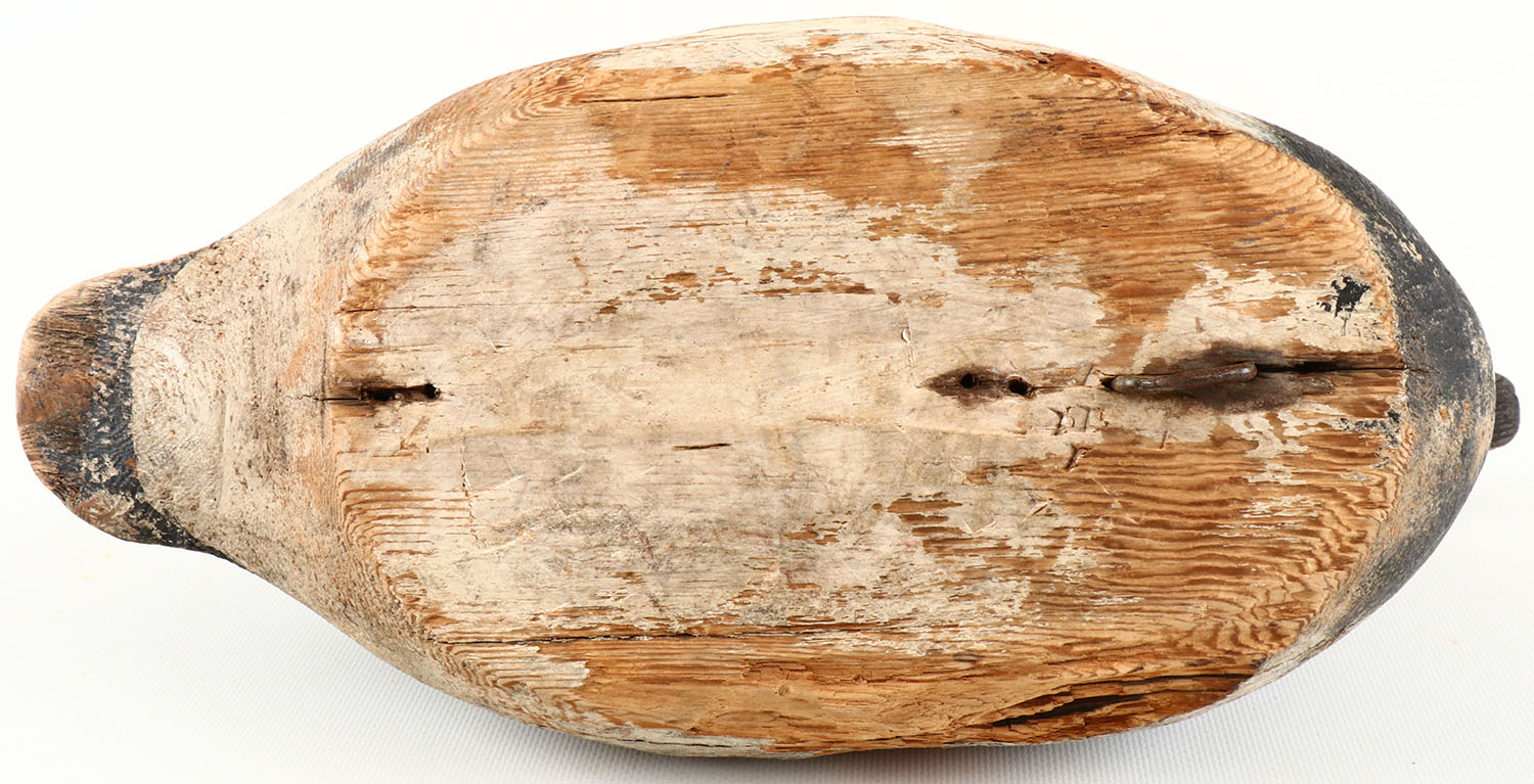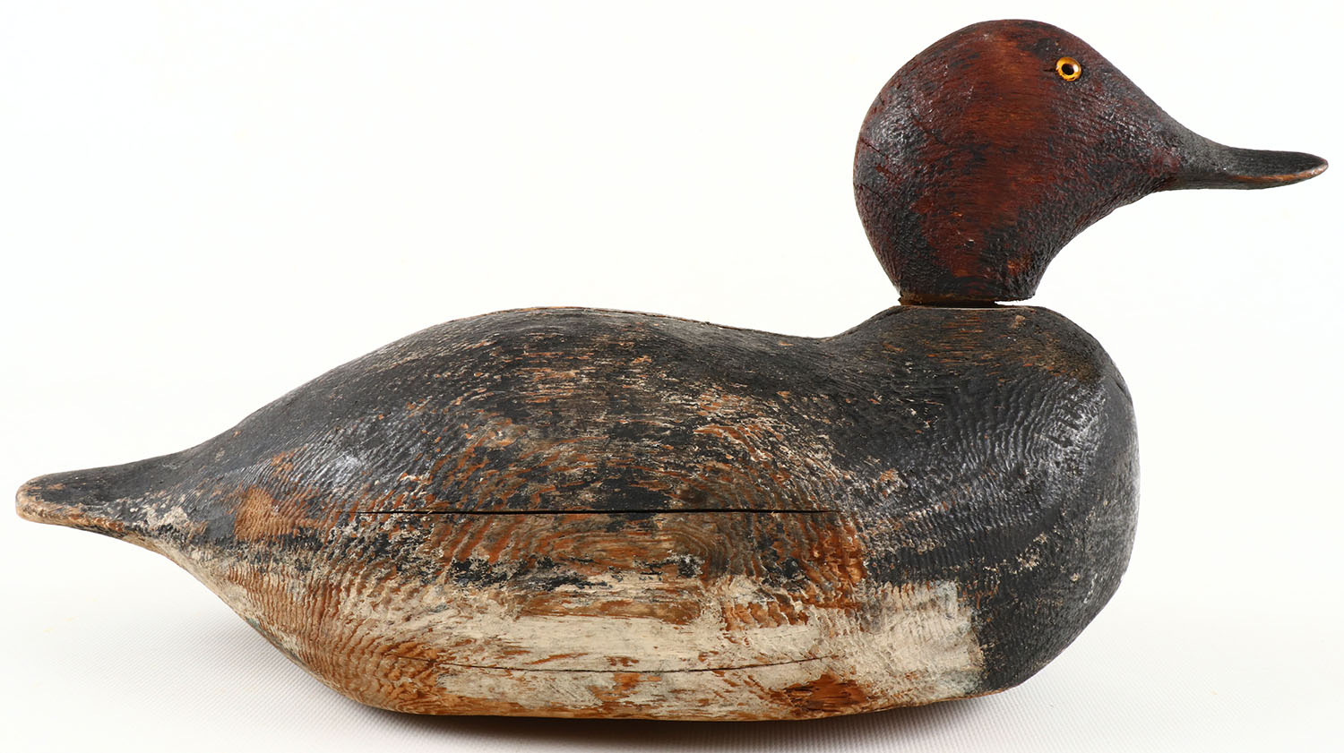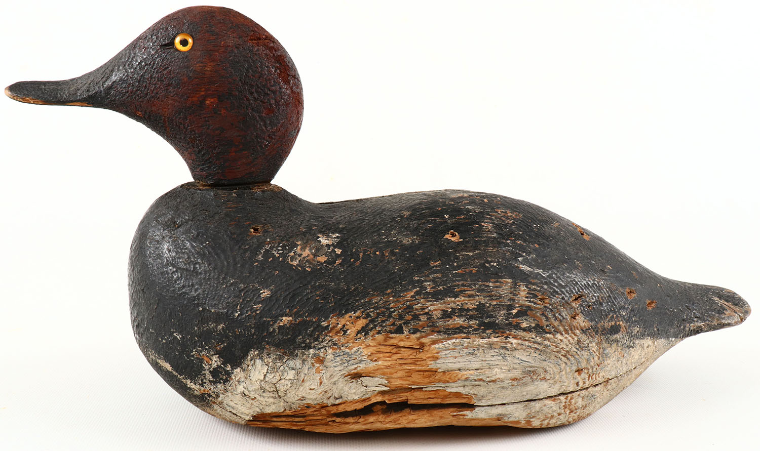 Redhead Drake by unknown maker (appears to have a head replacement), glass eyes, solid wood, neck is slightly loose, has hairline cracks on bottom, top, head, and sides, original paint. Grade: Very Good + - Value: 20 to 60