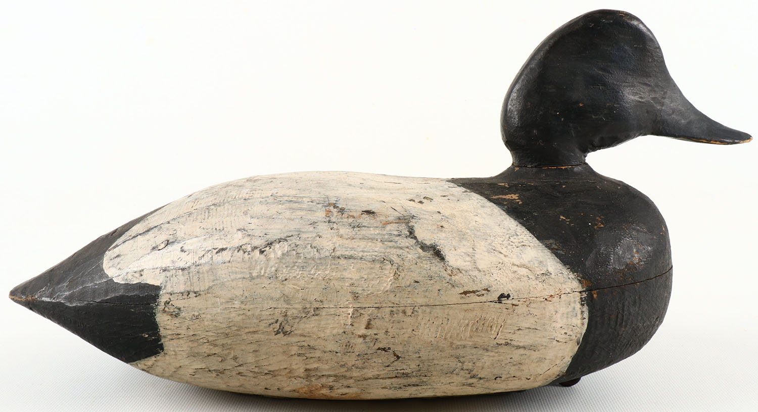 Bluebill Drake by unknown maker, painted eyes, structurally excellent, hollow wood, original paint with typical wear, plate on bottom is coming off. Grade: Very Good ++ - Value: 40 to 150