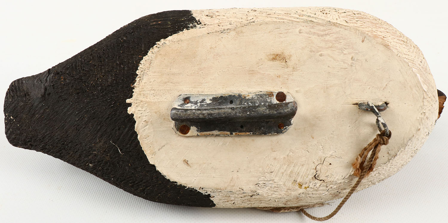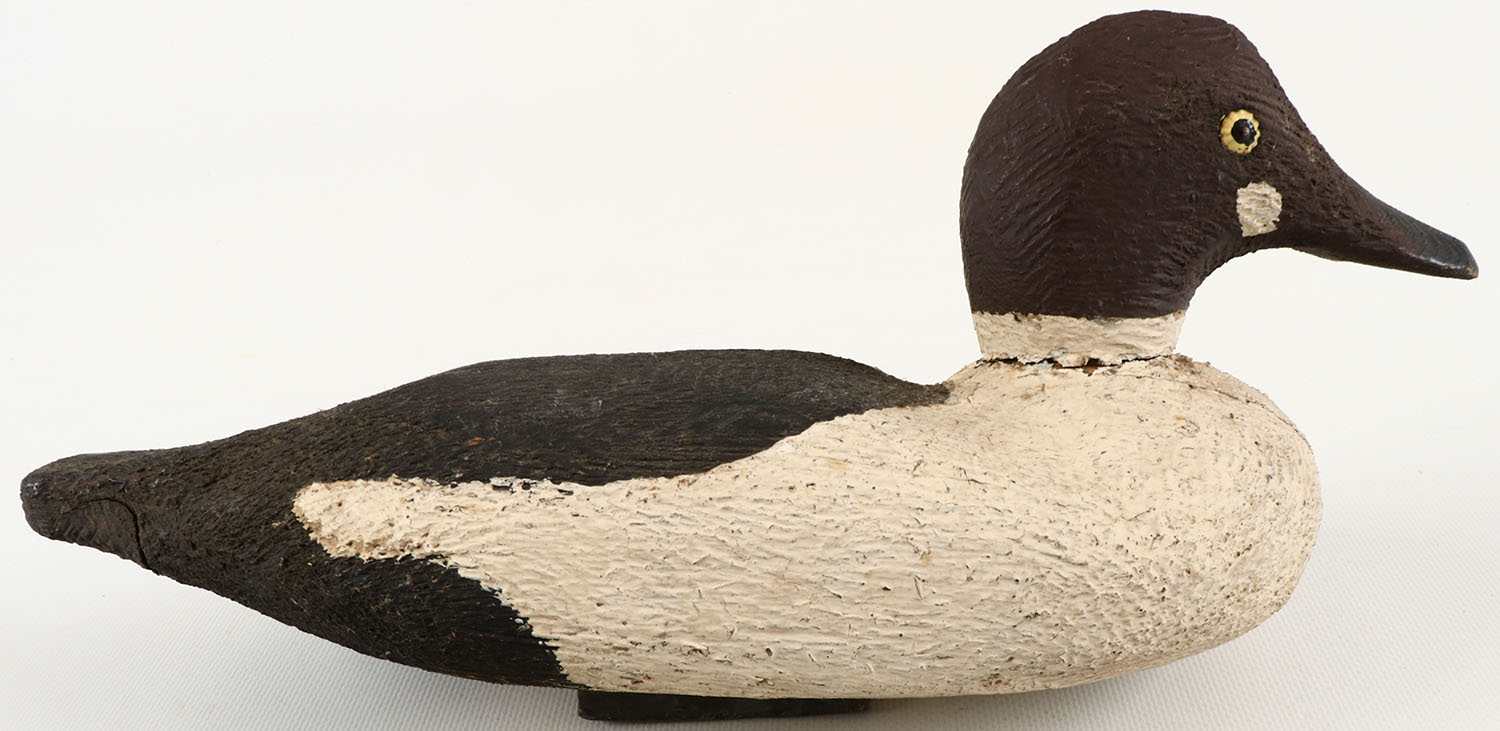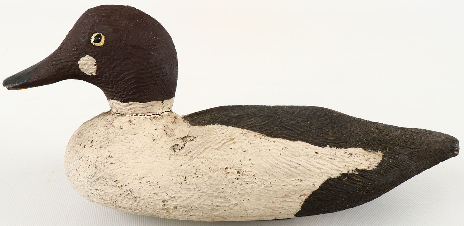 Goldeneye Drake by unknown maker, tack eyes, solid wood, neck is slightly loose, has age cracks, original paint. Grade: Very Good - Value: 40 to 150
