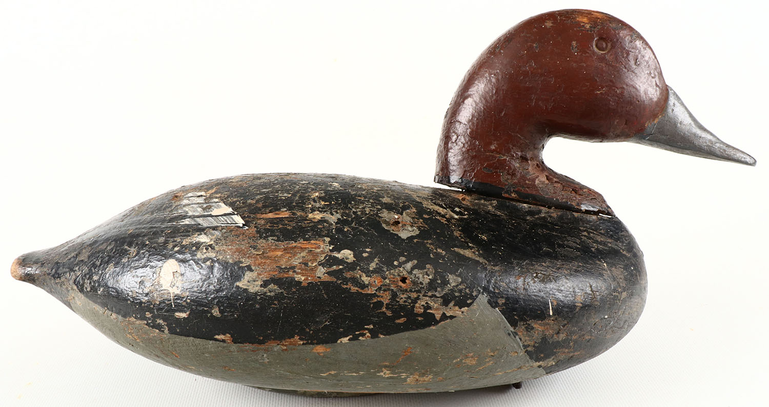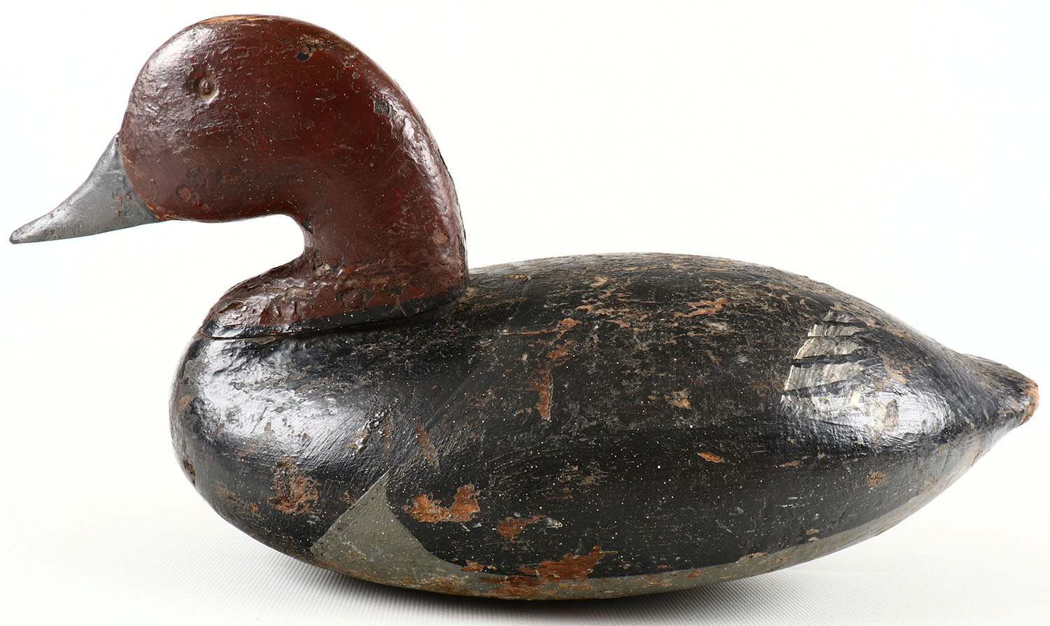 Redhead Drake by unknown maker (Ira Hudson style), carved eyes, structurally excellent, solid wood, neck is slightly loose, has hairline age cracks on bottom, shows edge wear, repainted. Grade: Very Good - Value: 40 to 150