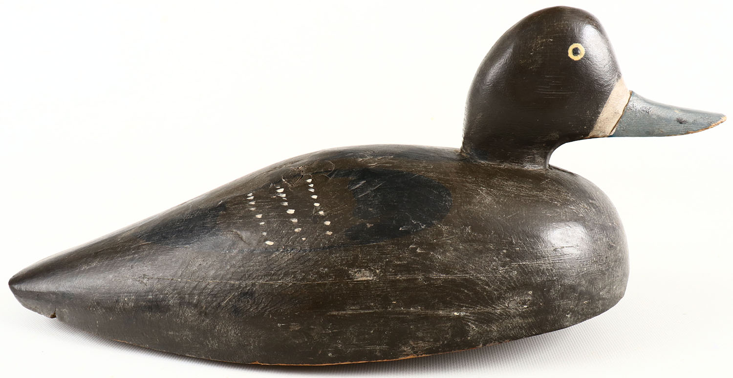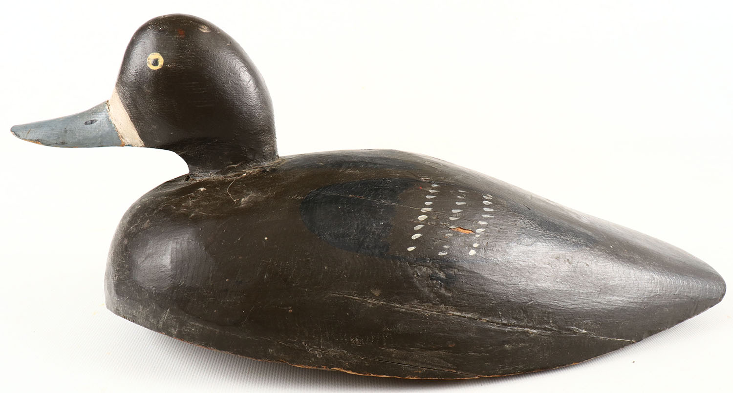 Bluebill Hen by unknown maker, painted eyes, structurally excellent, solid wood, has hairline age cracks, excellent original paint. Grade: Excellent - Value: 40 to 150