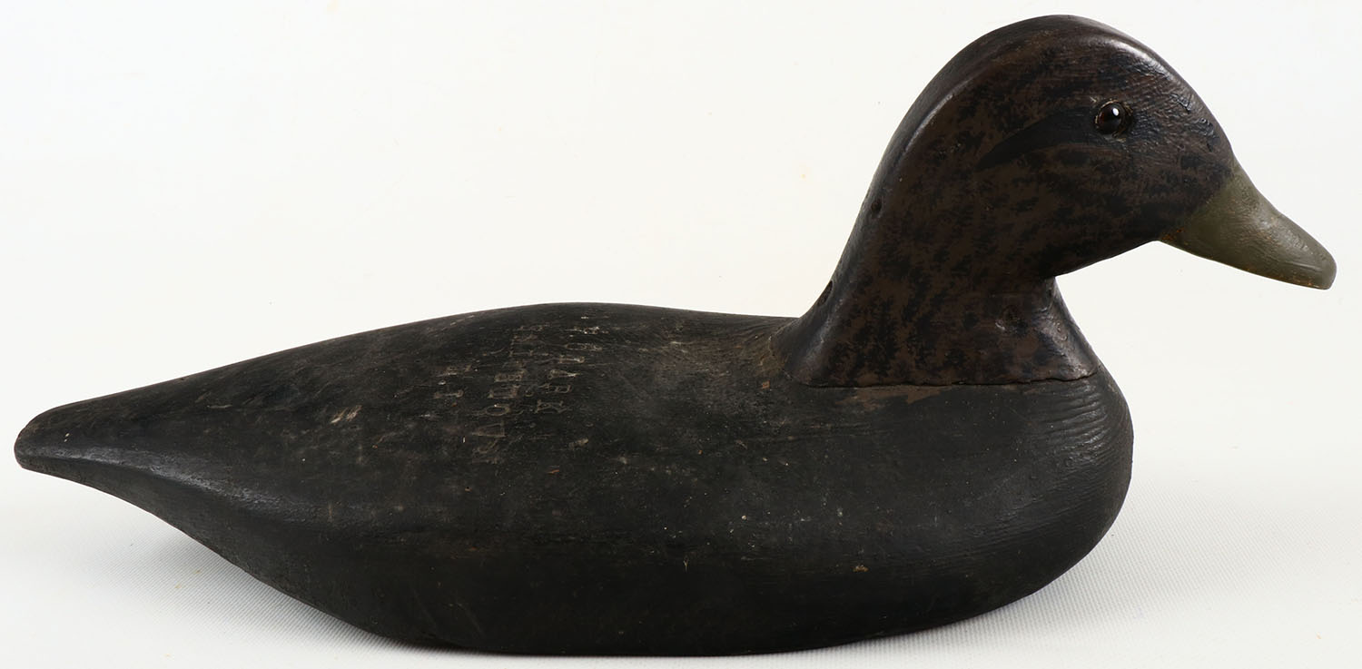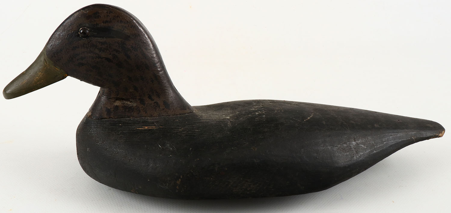 Black Duck by unknown maker, glass eyes, structurally excellent, solid wood, excellent original paint, branded W F CLARK, SMITHTOWN, L.I., New York. Grade: Excellent - Value: 100 to 200