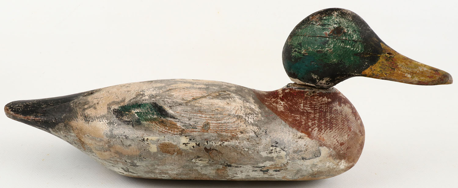Mallard Drake by Mason Decoy Company., 1896-1924 standard grade, tack eyes, structurally excellent, solid wood, head is loose, repainted. Grade: Very Good - Value: 20 to 100