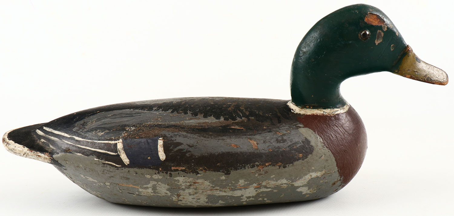 Mallard Drake by unknown maker, Illinois River, IL, glass eyes, structurally excellent, solid wood, excellent original paint with typical wear, has PREXN branded on bottom. Grade: Very Good ++ - Value: 20 to 100