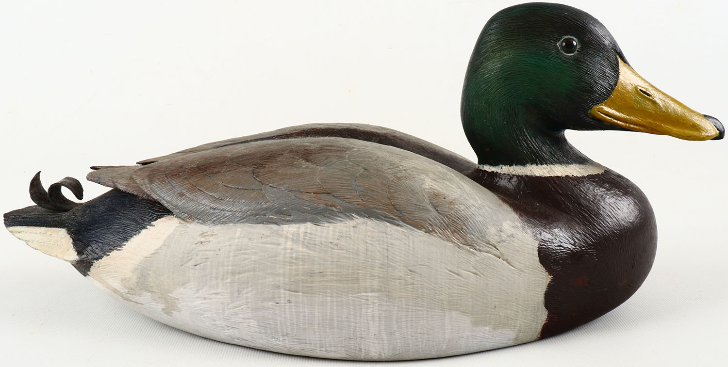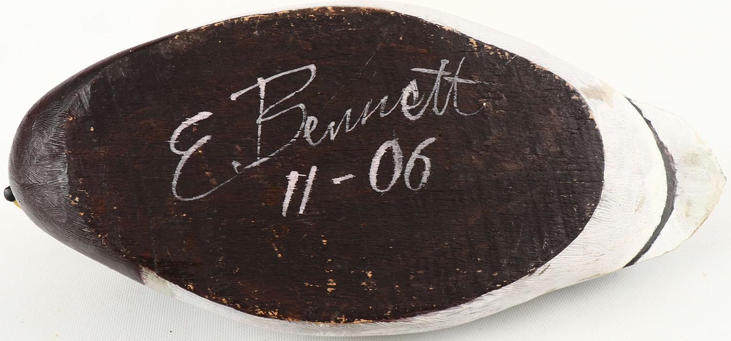 Mallard Drake by E. Bennett, glass eyes, structurally excellent, solid wood, excellent original paint, shows feather detail. Grade: MINT - Value: 20 to 100