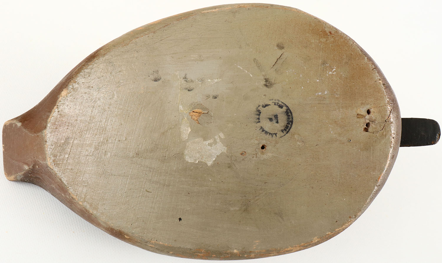 Canvasback Hen by Animal Trap Company, Pascagoula, MS, glass eyes, structurally excellent, solid wood, neck is loose, excellent original paint with typical wear, stamped on bottom. Grade: Excellent - Value: 40 to 150