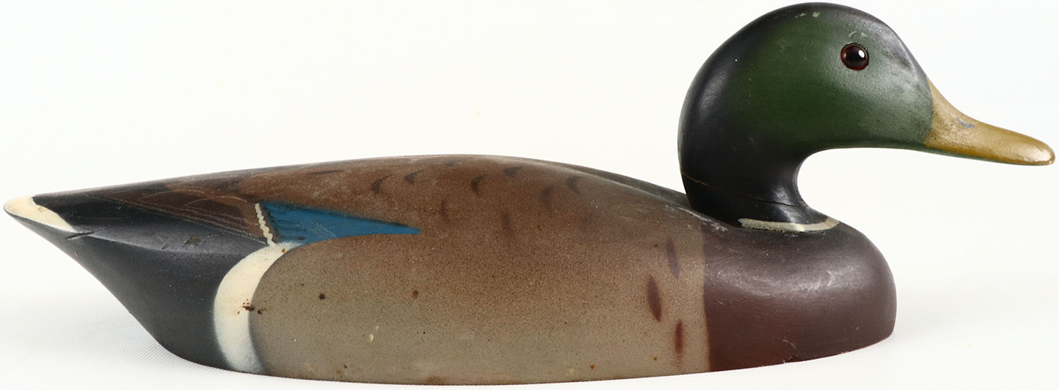 Mallard Drake by Wildfowler, glass eyes, has crack through midway of neck, solid wood, excellent original paint. Grade: Very Good ++ - Value: 40 to 150