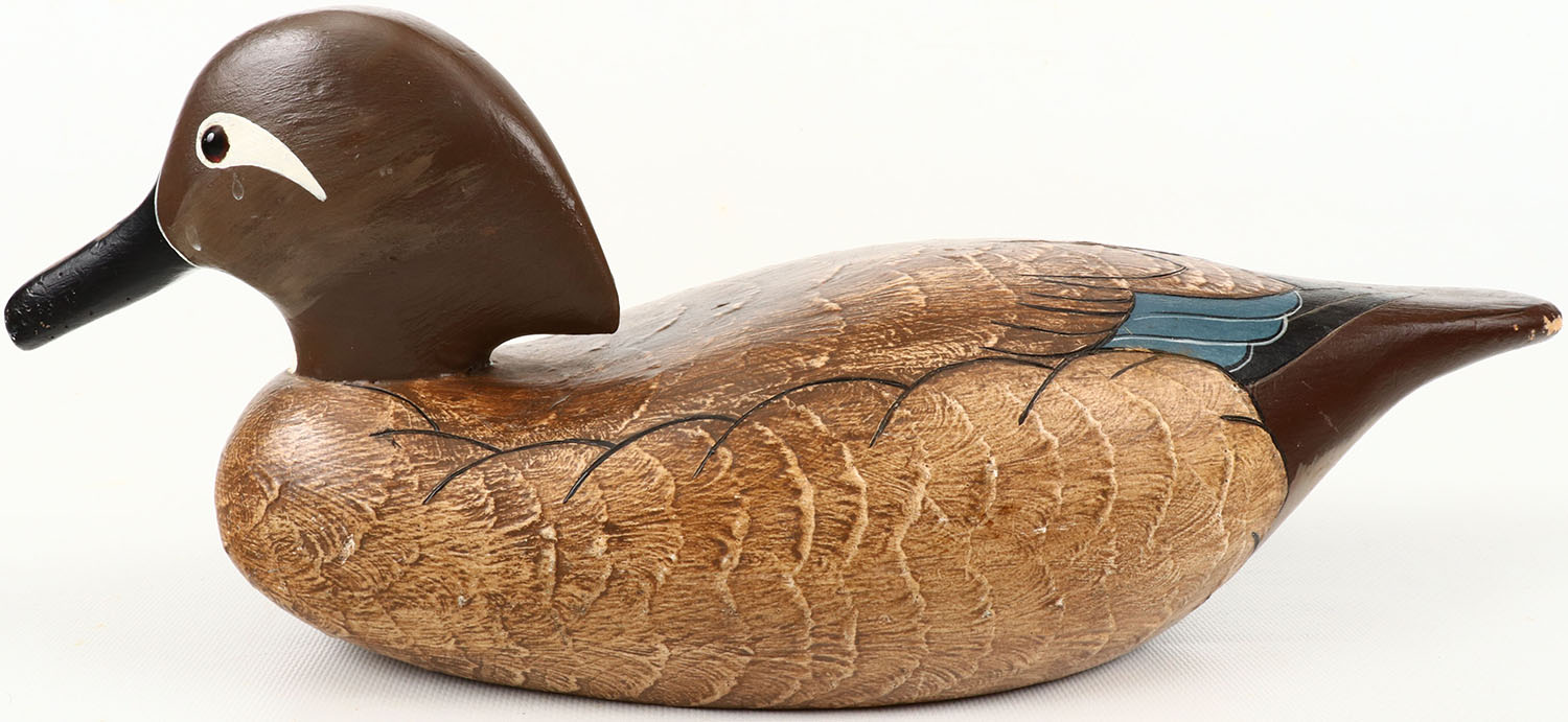 Woodduck Hen by Wildfowler Decoys, Babylon, N.Y. glass eyes, structurally excellent, solid wood, mint original paint. Grade: MINT - Value: 40 to 150