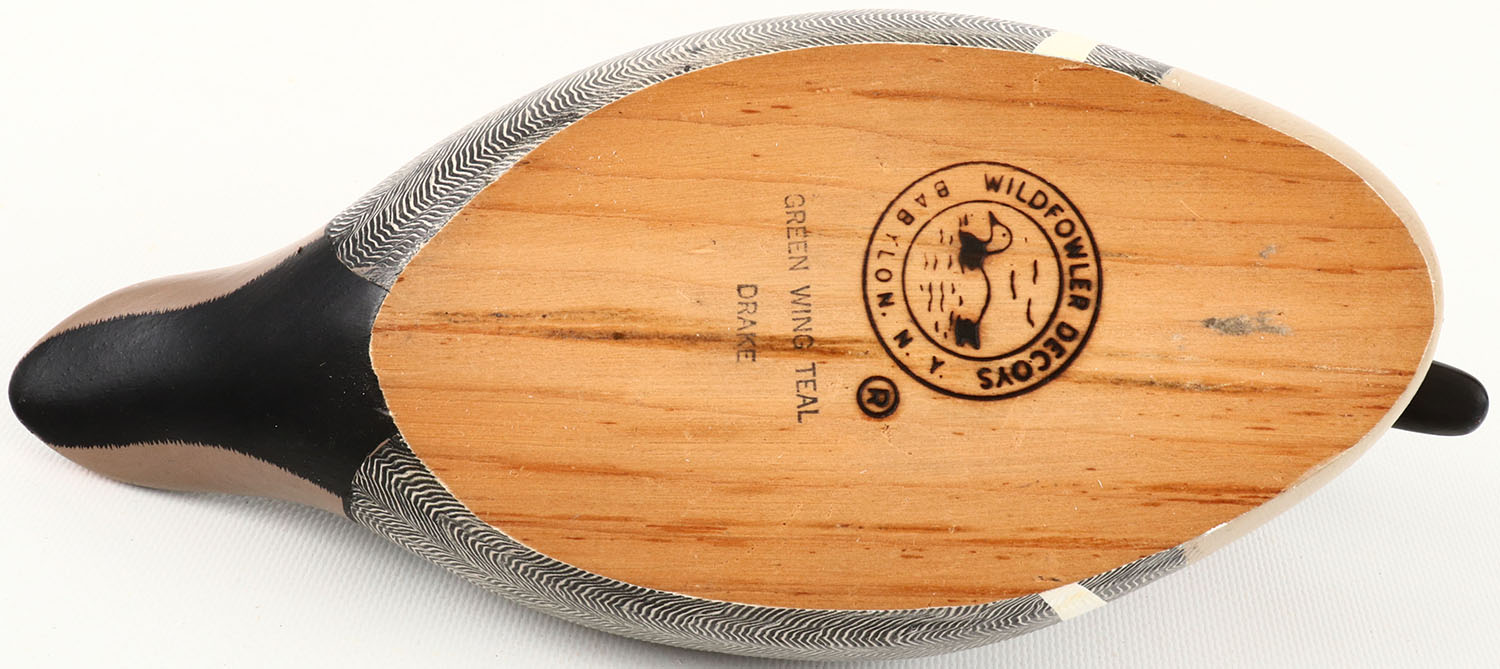 Green Wing Teal Drake by Wildfowler Decoys, Babylon, N.Y. glass eyes, structurally excellent, solid wood, mint original paint, excellent original comb painting. Grade: MINT - Value: 40 to 150