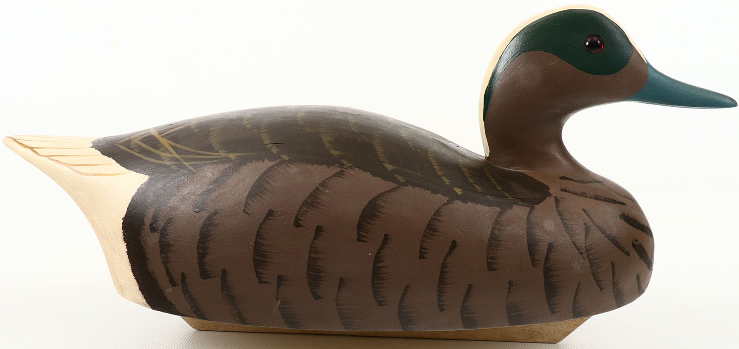 Widgeon Drake, Wildfowler Decoys Inc, Bohemia, N.Y, glass eyes, structurally excellent, hollow wood, mint original paint. Grade: MINT - Value: 40 to 150