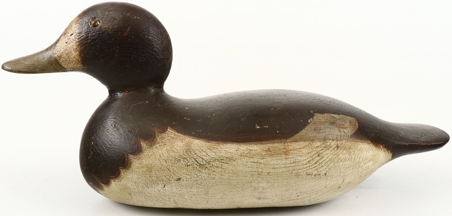 Bluebill Hen by Mason Decoy Co., 1896-1924, restored by Larry Rucker, glass eyes, structurally excellent, solid wood, excellent original paint with typical wear. Grade: Excellent - Value: 50 to 150