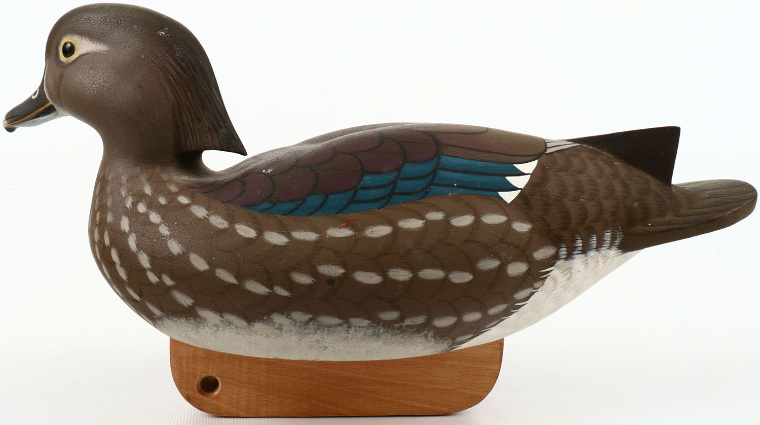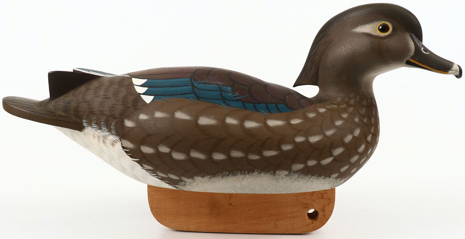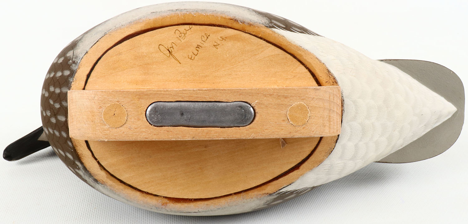 Woodduck Hen by Jon Bux Elmica California glass eyes, structurally excellent, hollow wood, excellent original paint, signed on bottom. Grade: Excellent - Value: 50 to 150