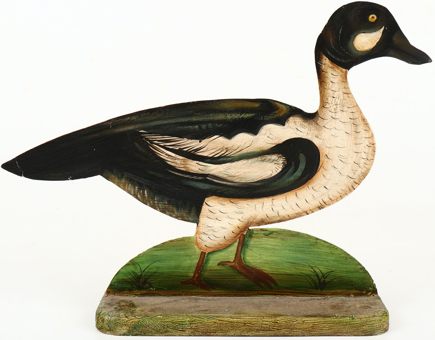 Goldeneye Drake by unknown maker, metal silhouette on wood bottom board, painted eyes, wonderful original paint on one side. Grade: Excellent - Value: 10 to 50