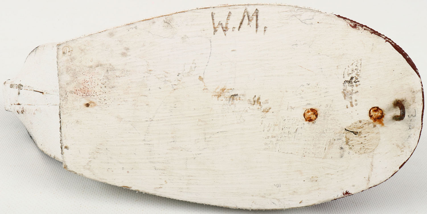 Woodduck Drake by unknown maker, NC, glass eyes, wood head, canvas over wire body, excellent original paint, branded W.M. on bottom. Grade: Excellent - Value: 20 to 40