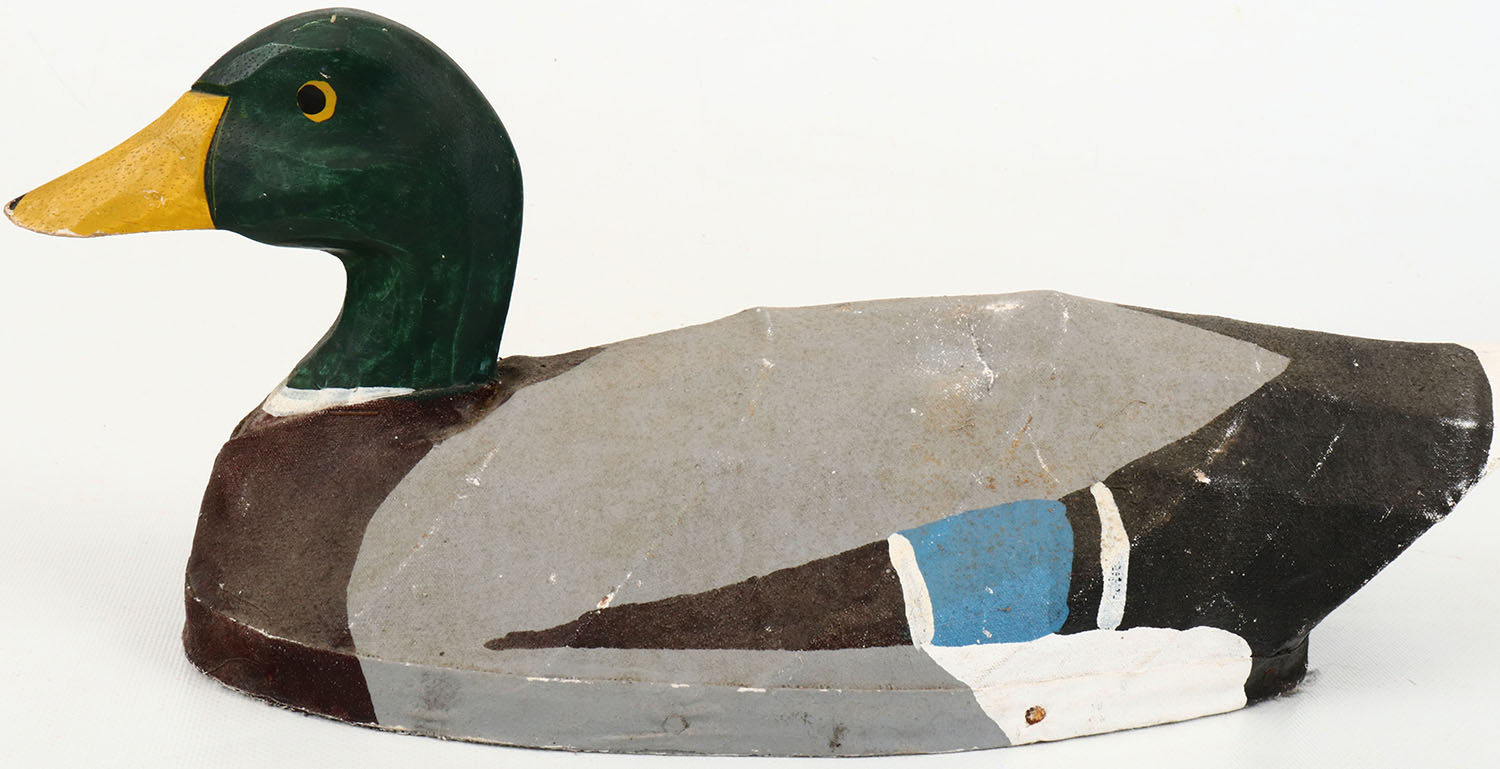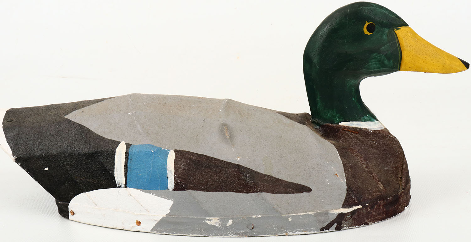 Mallard Drake by unknown maker, painted eyes, structurally excellent, wood head, canvas over wire body, excellent original paint, branded W.M. on bottom. Grade: Excellent - Value: 20 to 40