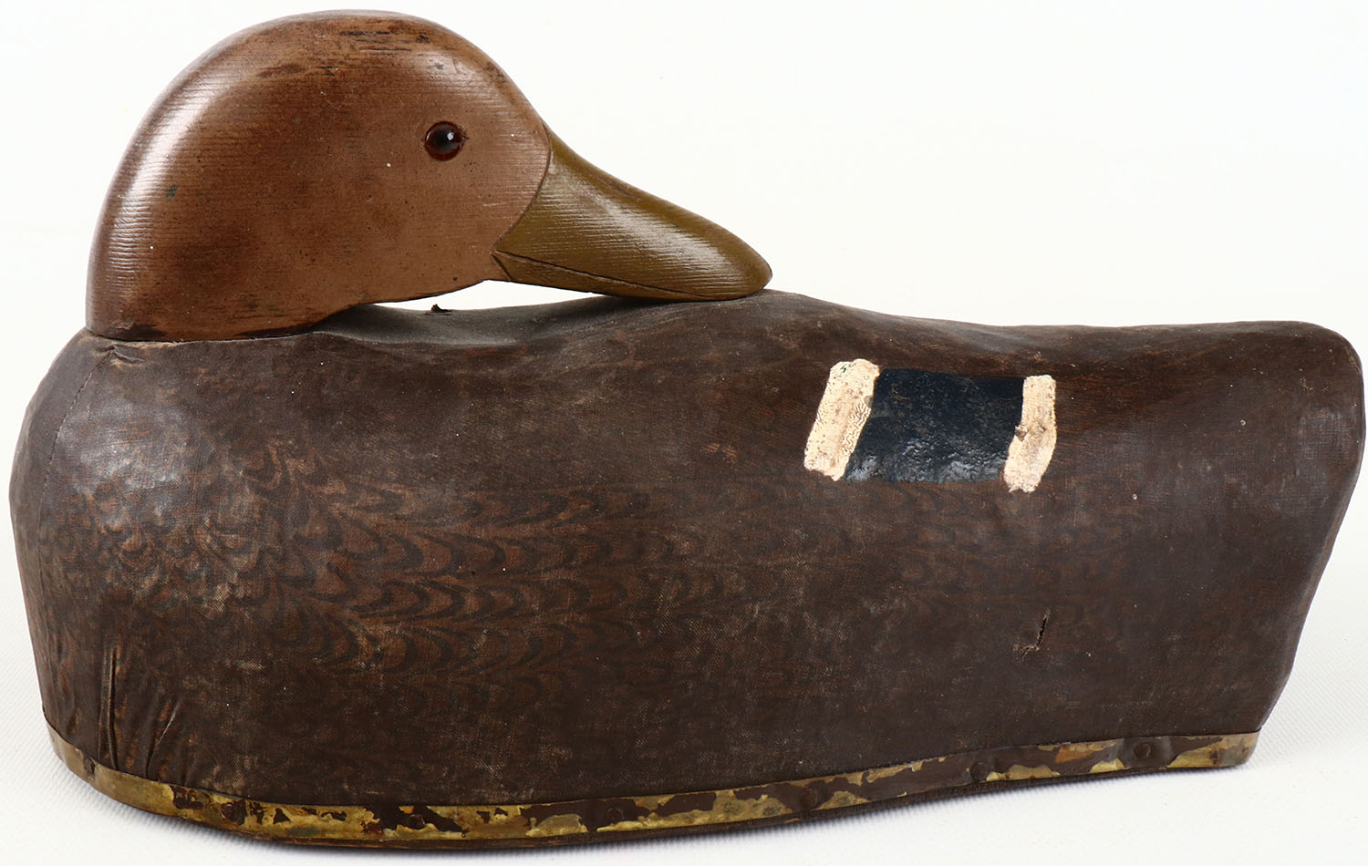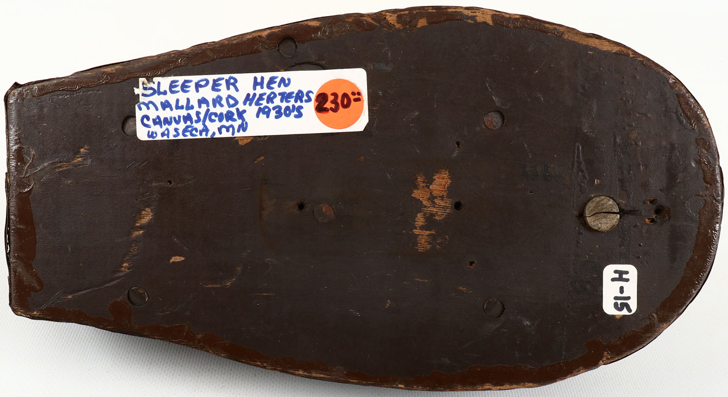 Sleeper Mallard Hen by Herters Inc., canvas over cork, glass eyes, original paint, structurally excellent, has rare early metal bottom band. Grade: Excellent - Value: 50 to 150