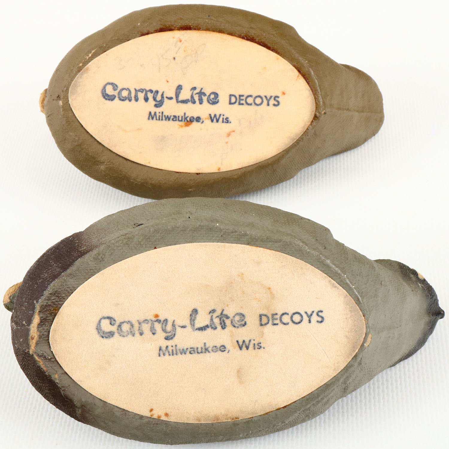 SALESMAN SAMPLE Pair of Mallards by Carry-Lite Decoys, Milwaukee, Wis., well marked, PE, paper mache', original paint shows light wear. Grade: Excellent - Value: 20 to 50