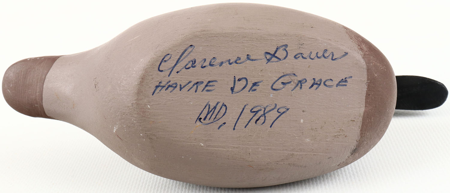 Miniature Canvasback Hen by Clarence Bauer, Havre de Grace, MD., painted eyes, structurally excellent, solid wood, excellent original paint. Grade: MINT - Value: 10 to 30