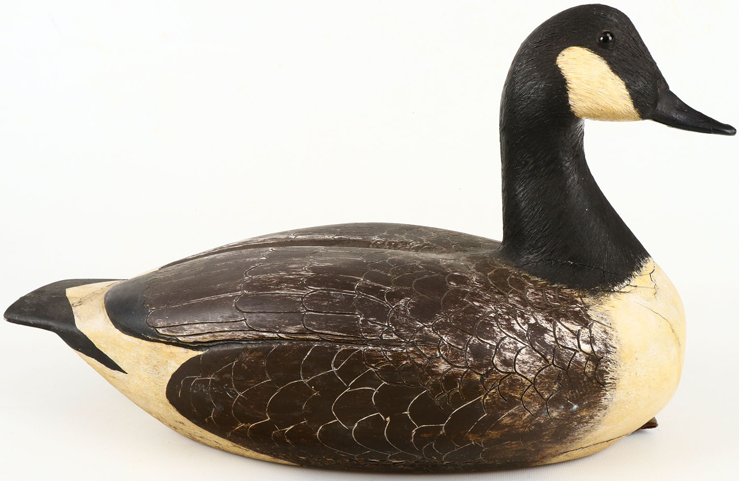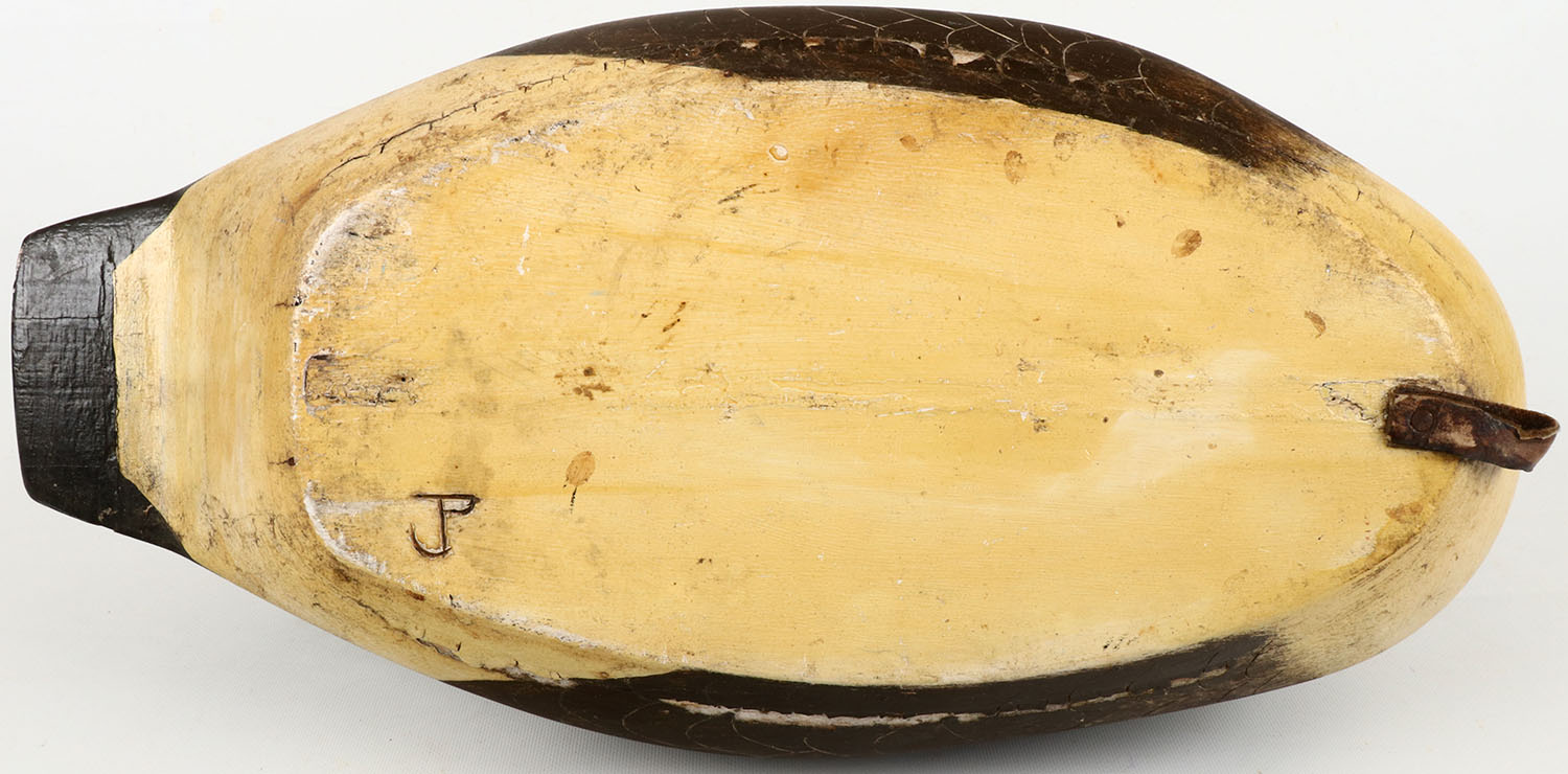 Canada Goose by unknown maker, glass eyes, hollow wood, original paint with comb painting, has hairline age crack at the front of the neck, branded J on bottom. Grade: Very Good ++ - Value: 50 to 100