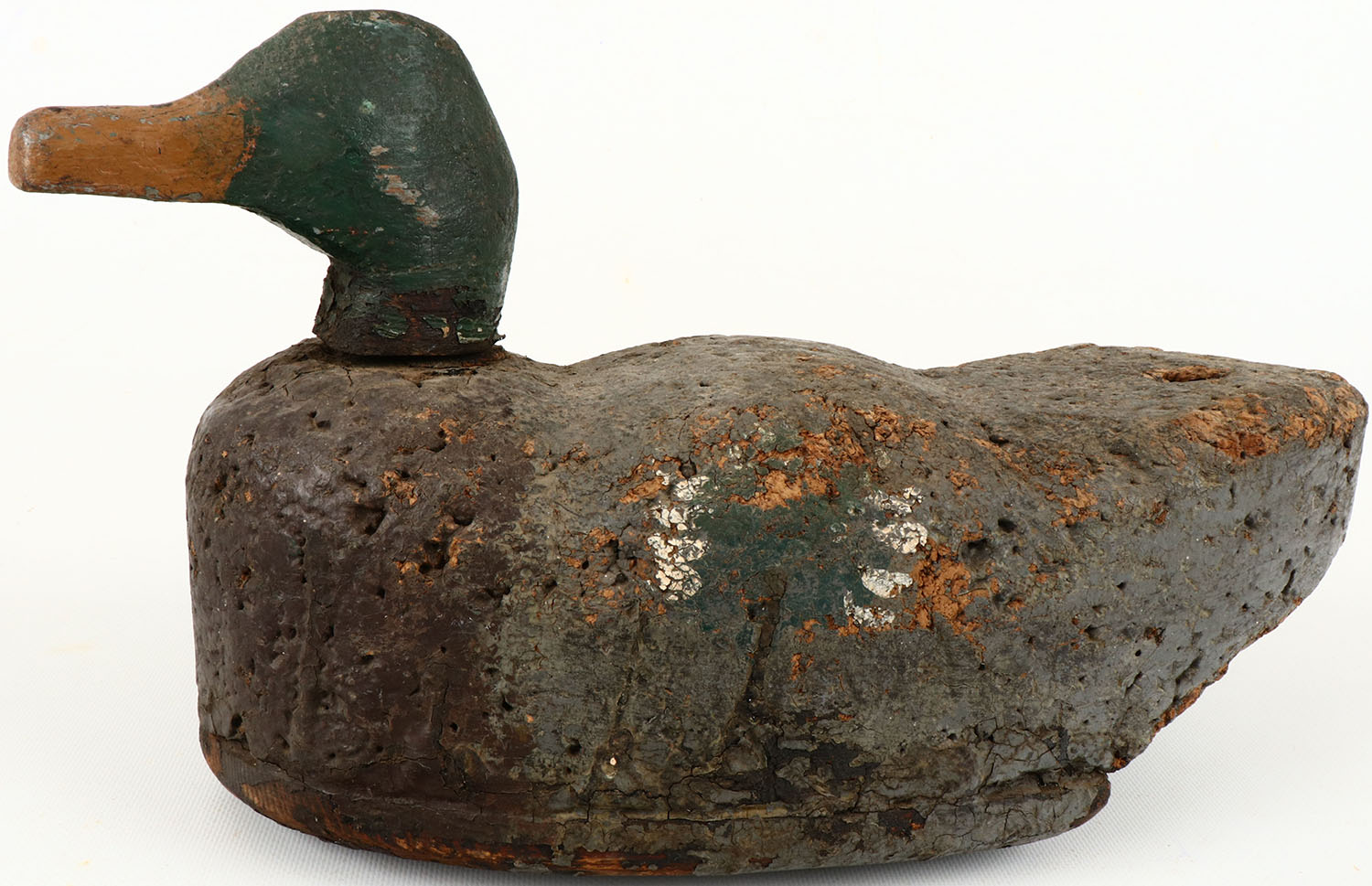 Mallard Drake by Oscar Quam?, no eyes, solid cork body, original paint shows wear. Grade: Very Good + - Value: 30 to 60