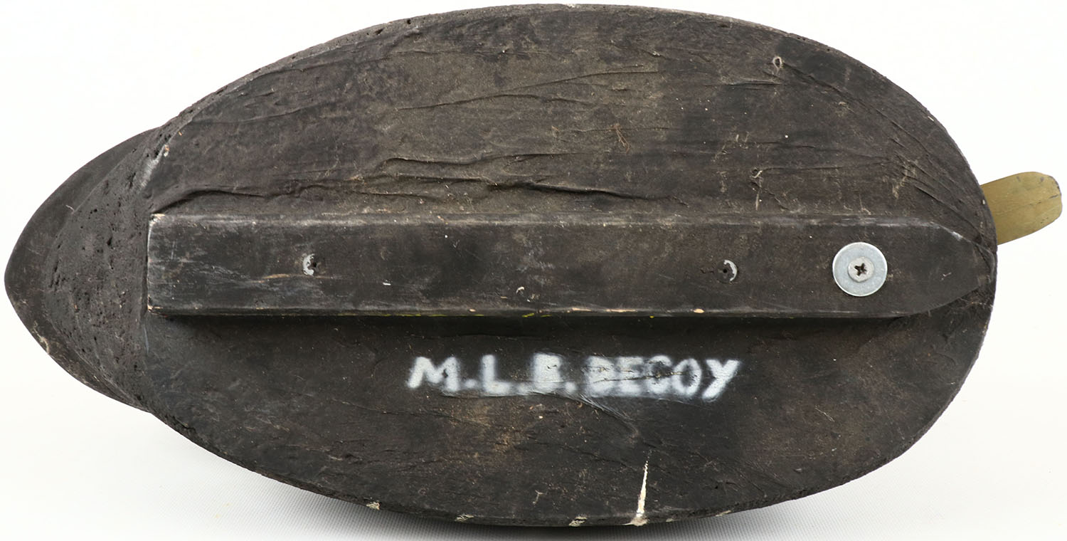 Black Duck by Herters, TE, painted eyes, solid cork body, original paint, branded MLB Decoy. Grade: Excellent + - Value: 20 to 60