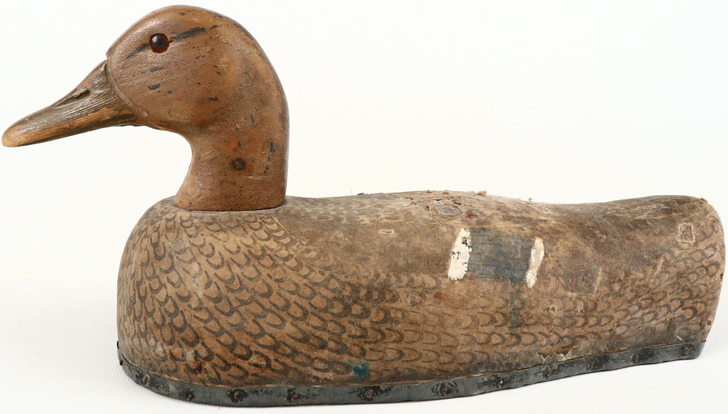 Mallard Hen by Herters Inc., canvas over cork, glass eyes, original paint, has tears to top of back with scuffing, structurally excellent, has rare early metal bottom band. Grade: Very Good - Value: 80 to 200