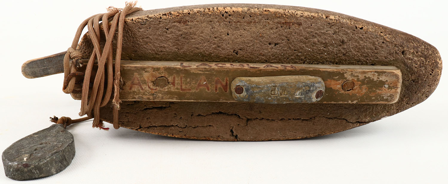 Mallard Hen by unknown, branded ''LACHLAN'', TE, solid cork, head has a neck crack, original paint. Grade: Very Good - Value: 30 to 50
