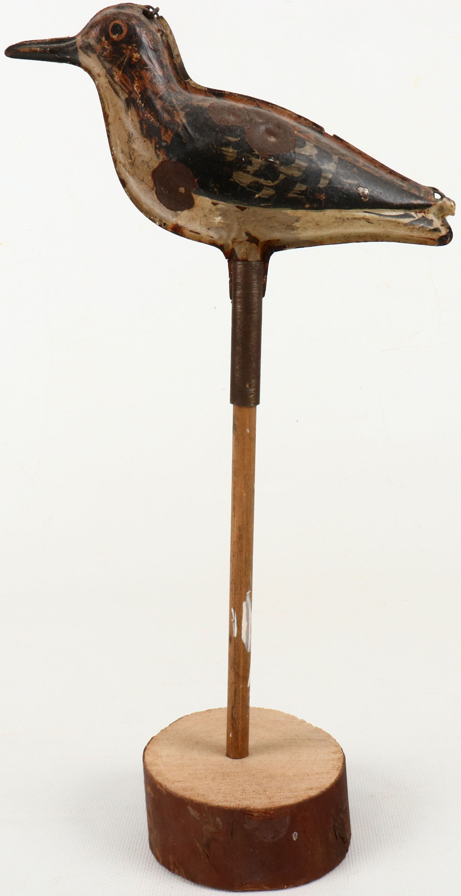 Metal 2pc. Peep, Shorebird by Strater & Sohier, Boston MA, painted eyes, with wire hinges, dowel with base, original paint, 7'' OAL. Grade: Excellent - Value: 150 to 300