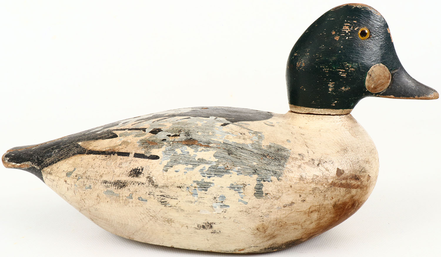 Goldeneye Drake by unknown, GE, solid wood, original paint shows wear, large chip repair to tail & age crack to back, head is loose on dowel. Grade: Very Good - Value: 50 to 150