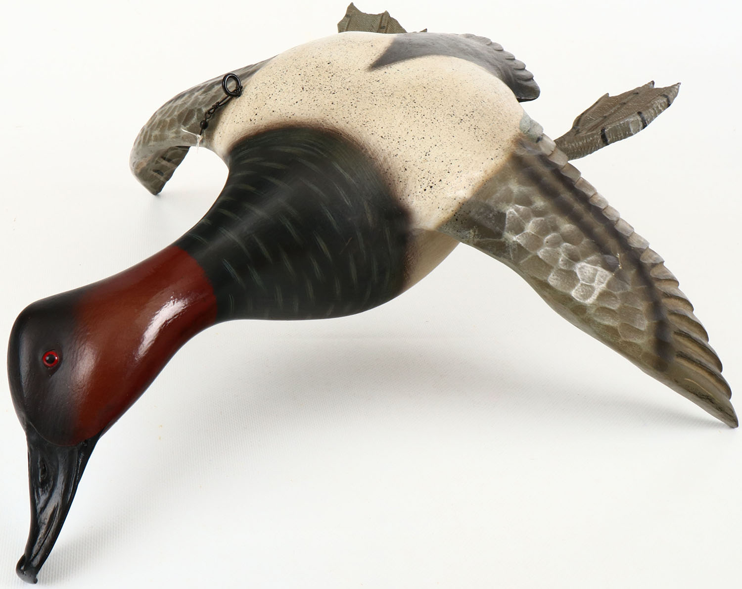 Ducks Unlimited Reproduction of a Flying Canvasback Drake by Borrett, Made of resin, glass eye, structurally excellent after left leg repair. Excellent paint. Grade: Excellent+ - Value: 100 to 500