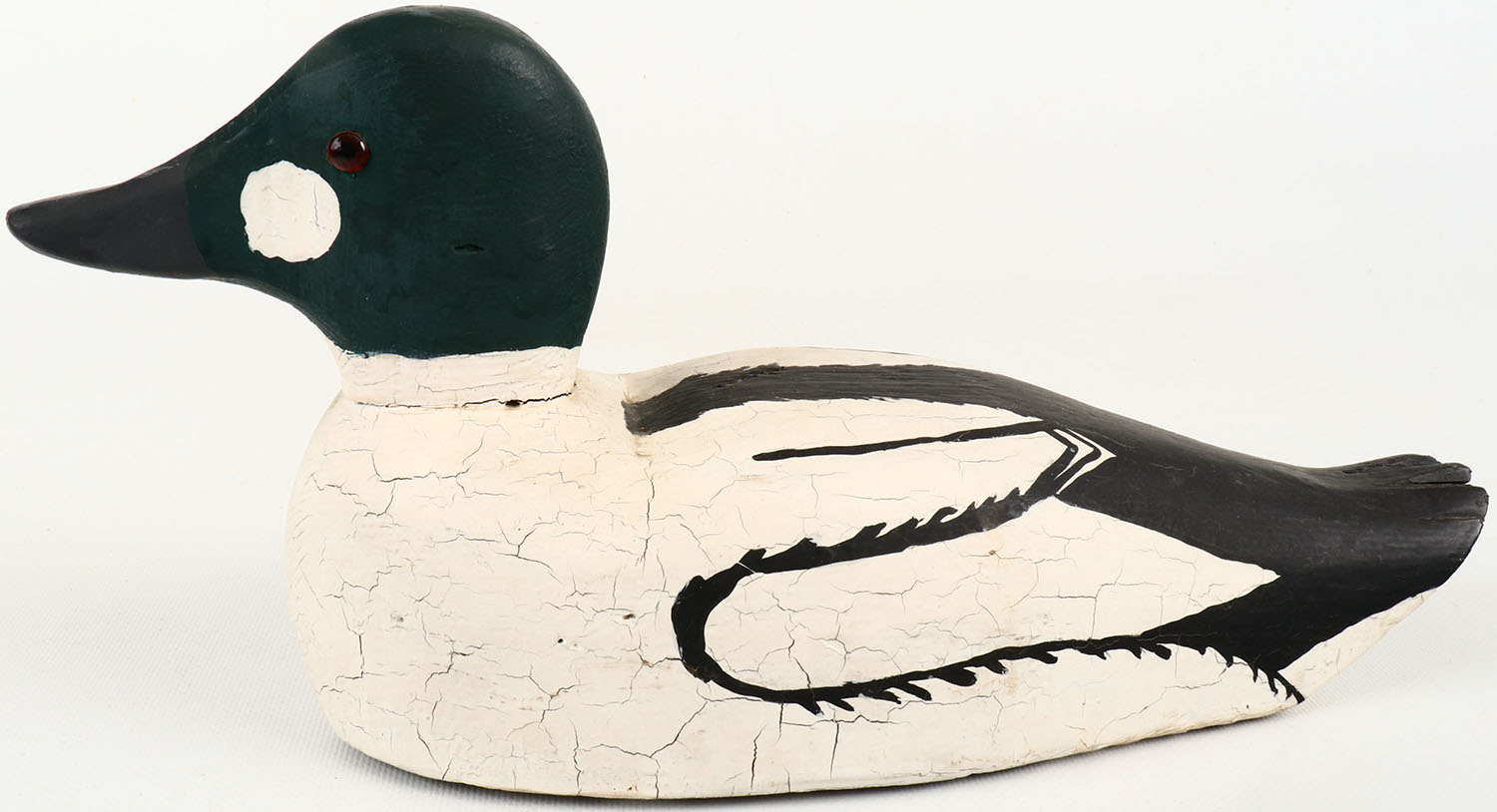 Goldeneye Drake by unknown maker, glass eyes, solid wood, original paint shows crazing. Grade: Excellent - Value: 30 to 60