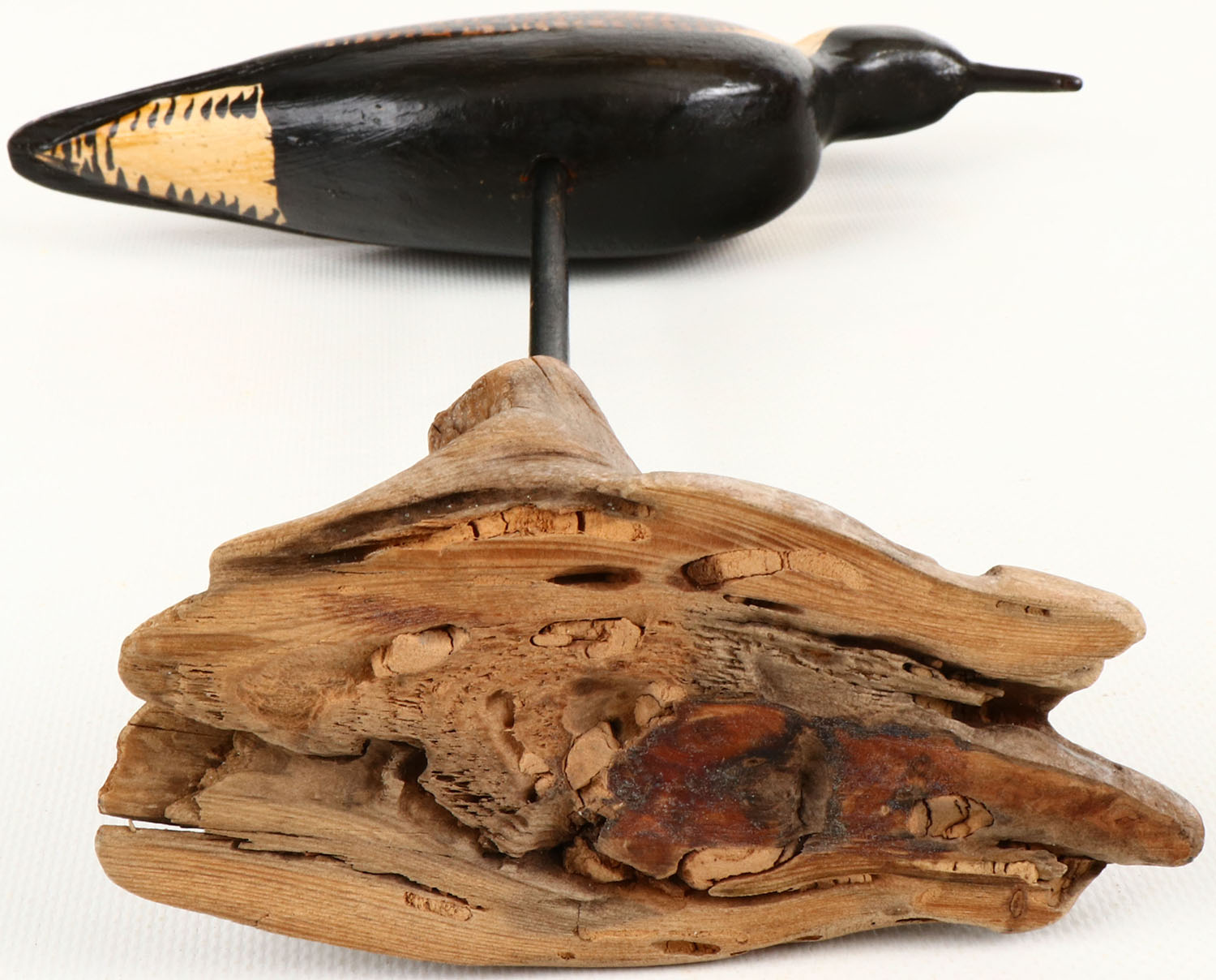 Black Belly Plover by unknown maker, no eyes, solid wood, on wood stand, excellent original paint. Grade: Excellent + - Value: 30 to 60