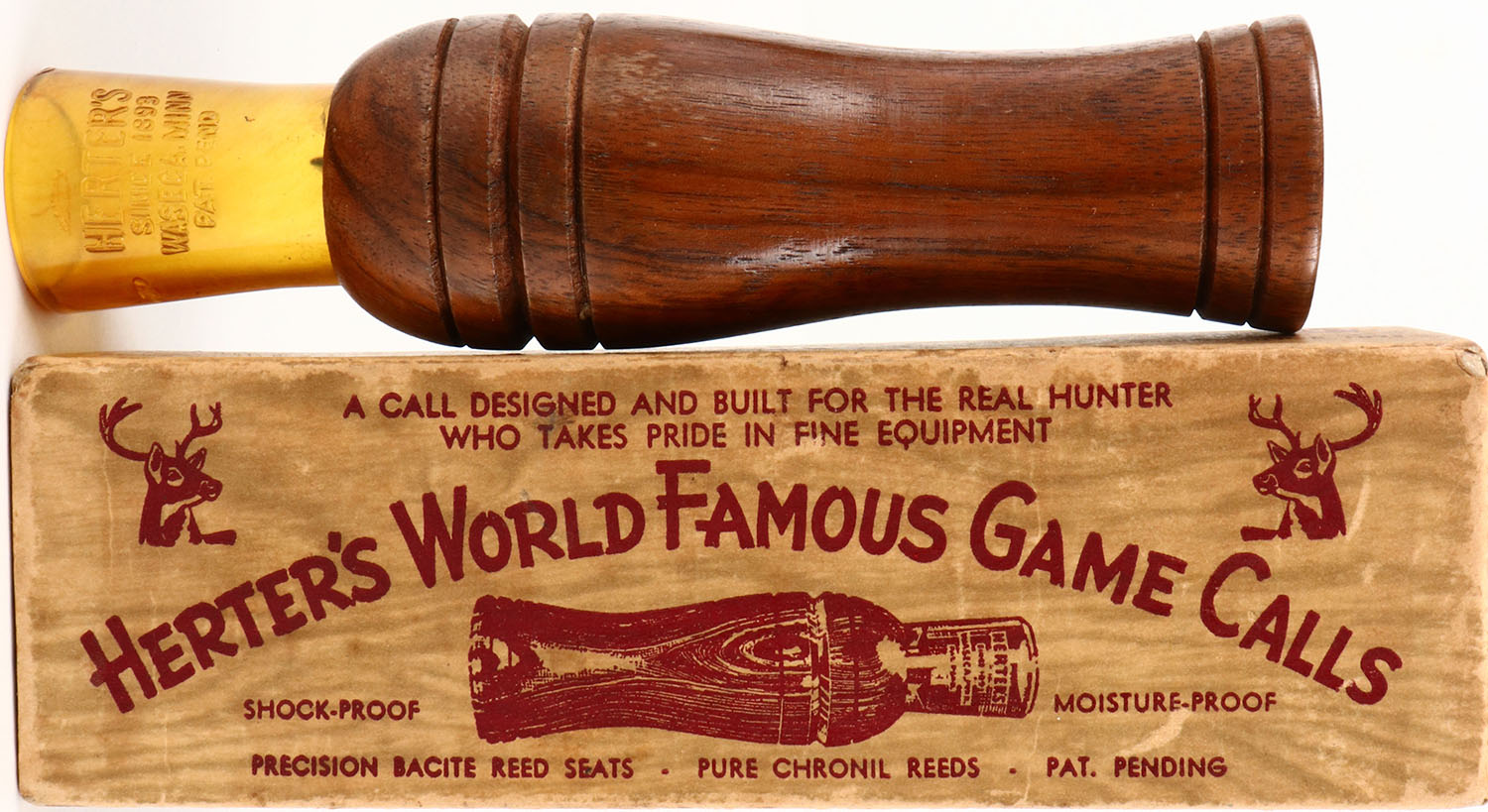 Herters Deer Call. Very Rare Model No. C903 with Yellow Stopper and Long Barrel. Box & Instructions, Lodermeier Collection. Grade: Excellent - Value: 10 to 40
