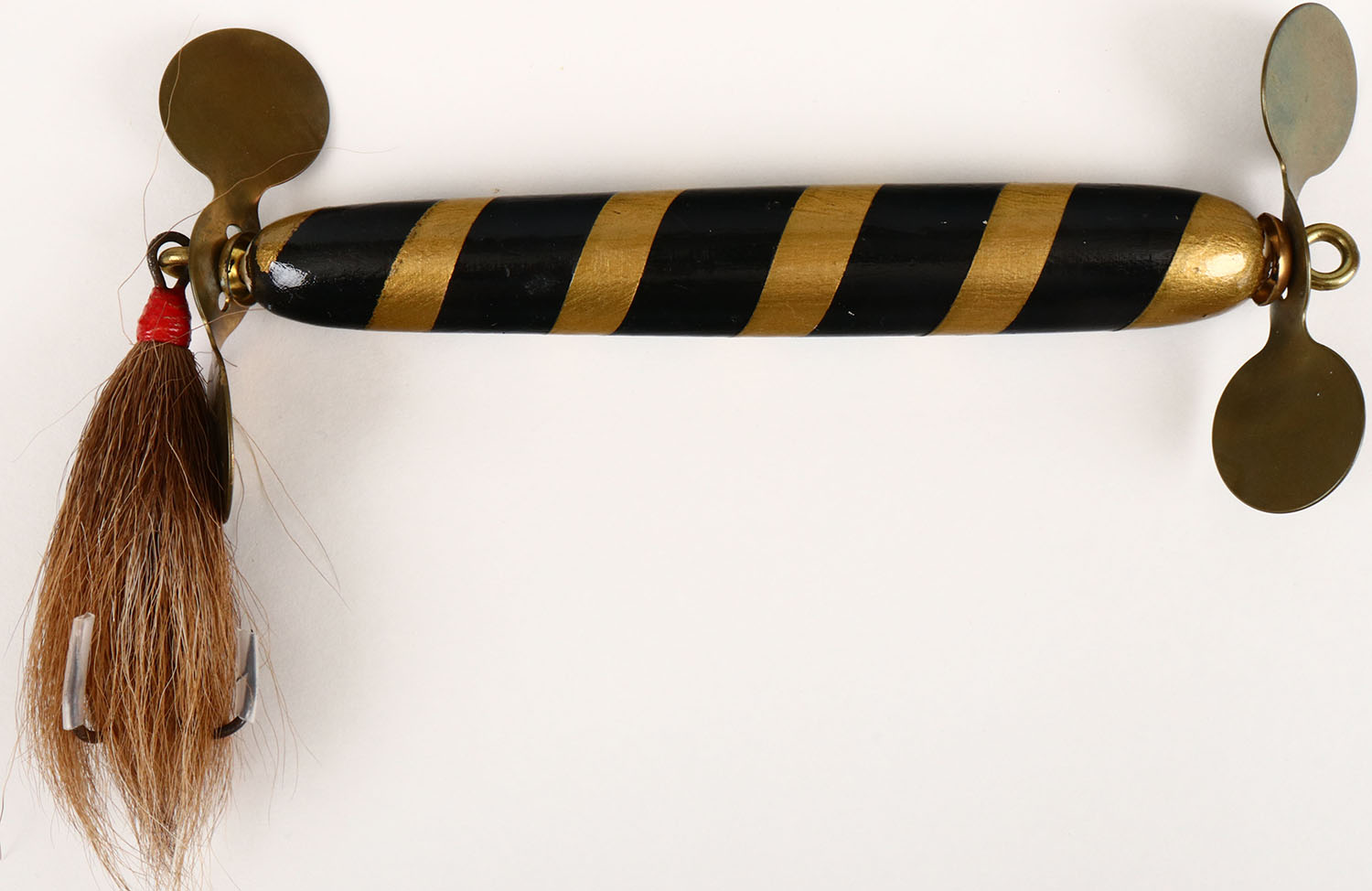Custom two spinner fishing lure with elk hair skirt, single hook, black & gold spiral paint, 6 1/2'' with out the hook. Grade: Excellent ++ - Value: 20 to 60