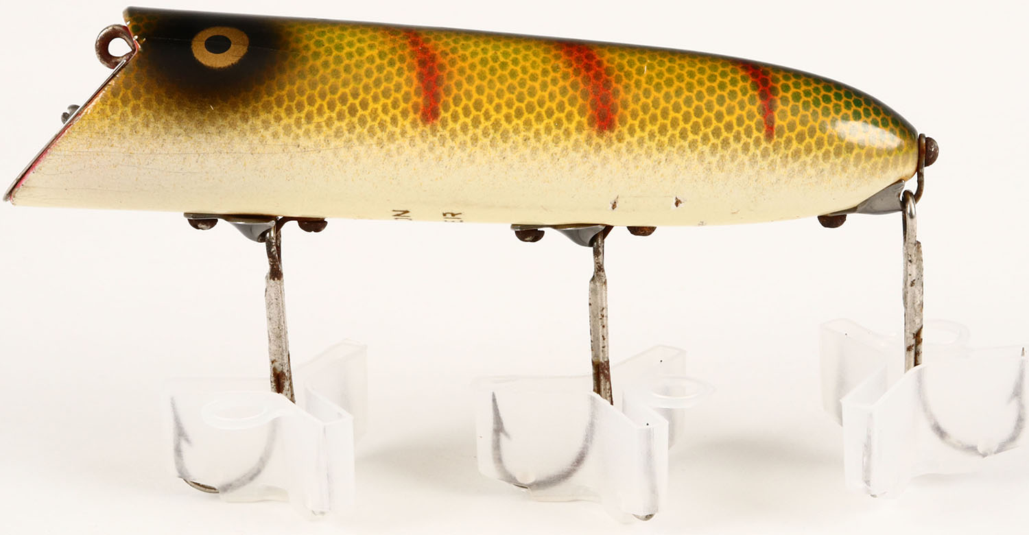 Heddon Basser, PE, 3 hook wood lure, surface rig, green & yellow scale. Grade: Excellent + - Value: 10 to 60