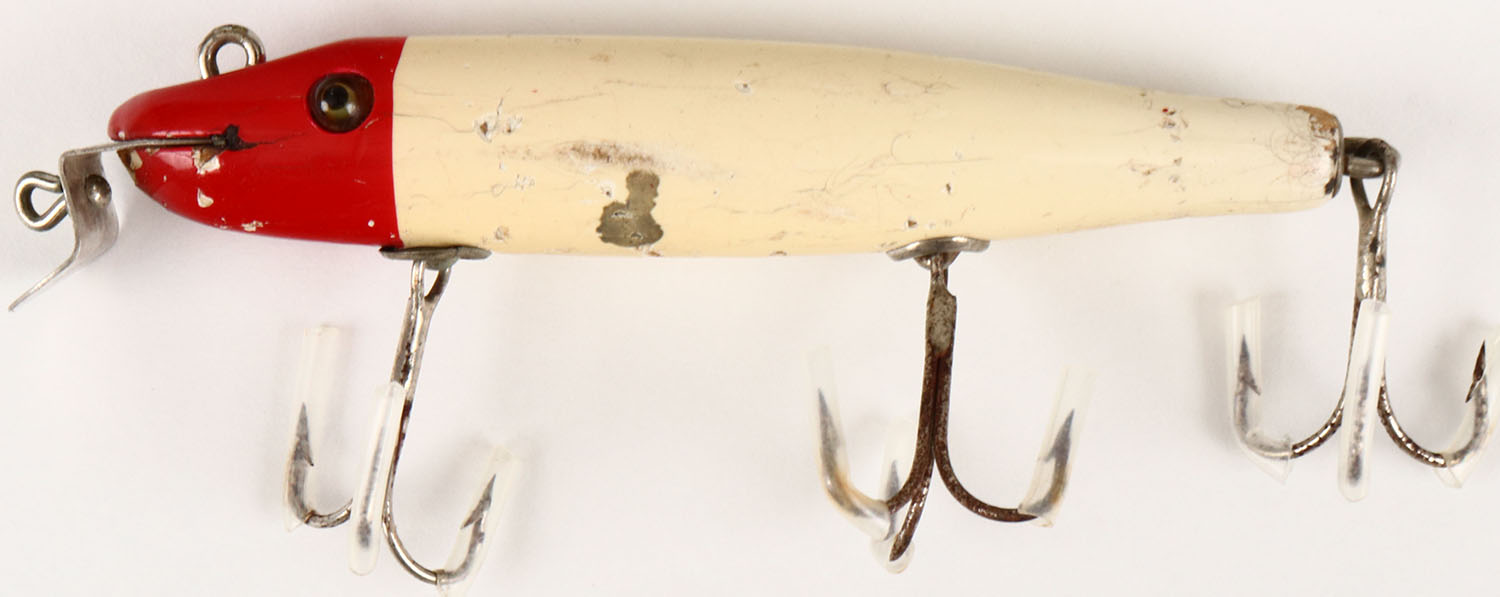 Creek Chub Pikie Minnow, GE, red & white, has metal lip, 3 hook lure. Grade: Excellent + - Value: 10 to 30