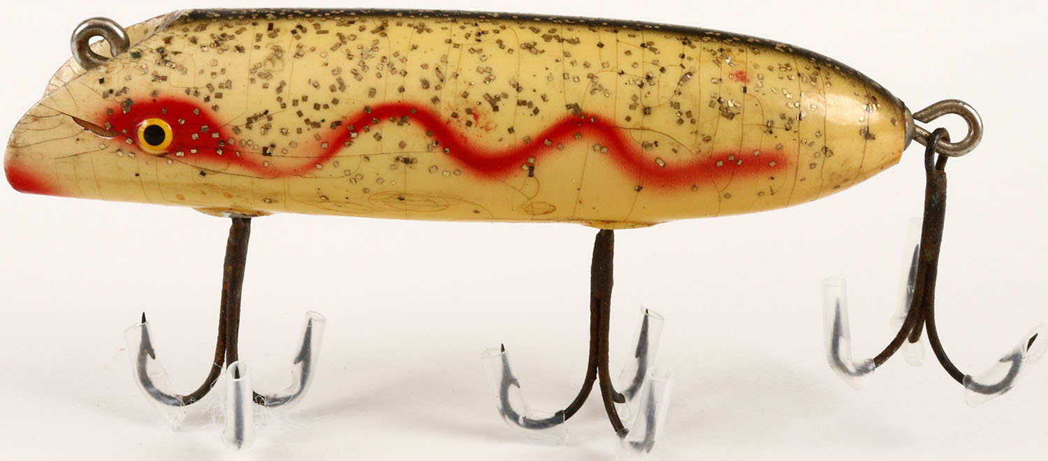 South Bend Bass-Oreno lure, TE, cream with red stripe & gold fleck, 3 hooks, very nice condition. Grade: Excellent + - Value: 10 to 40