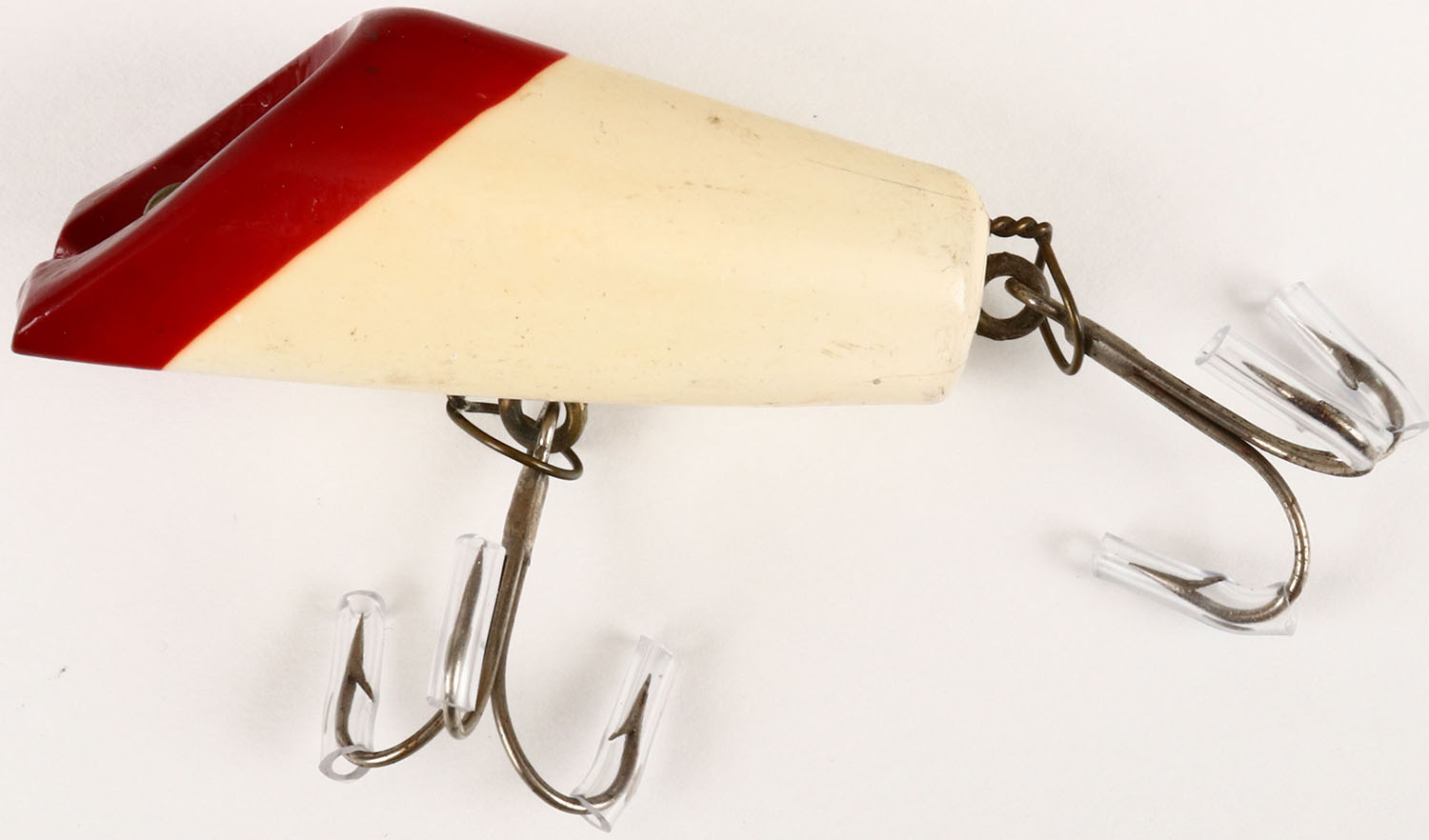 Shakespeare Jim Dandy fishing lure, circa 1910, red & white, 2 hook lure with spring wire to help control the hooks. Grade: Excellent ++ - Value: 40 to 100