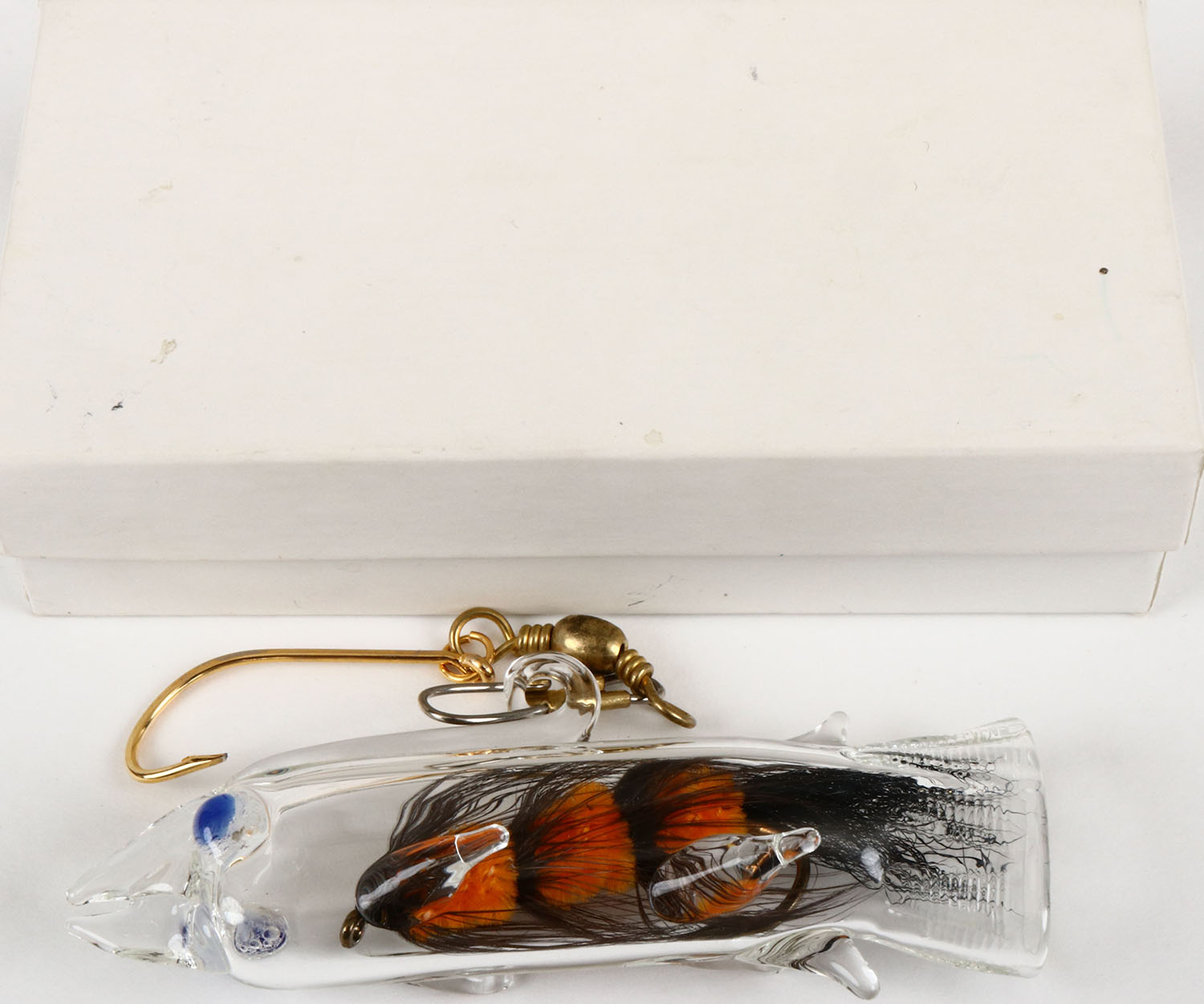 Glass lure with internal fly, PROTOTYPE, orange & black fly. Grade: MINT - Value: 10 to 100