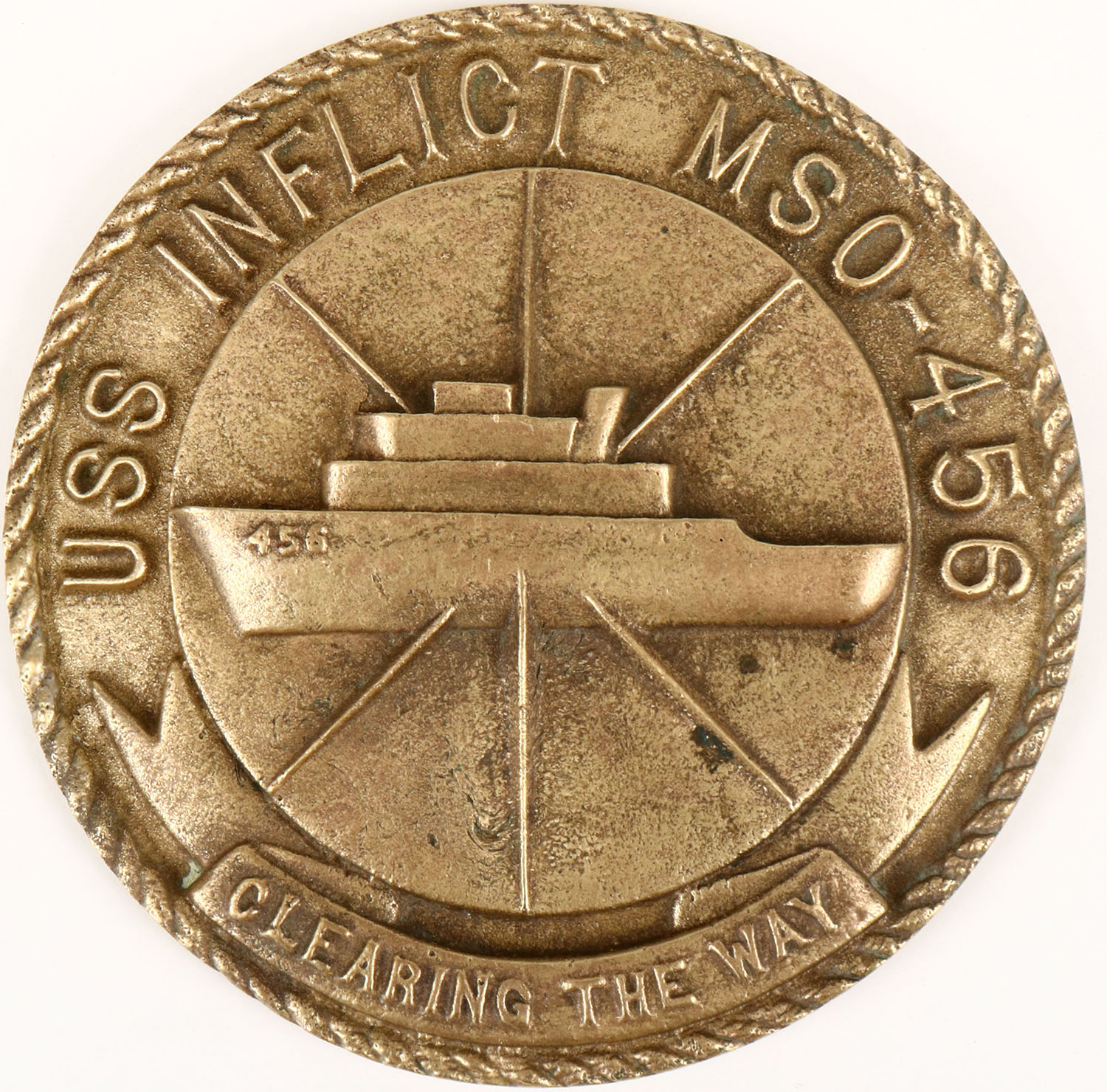 Brass Ships Badge, USS INFLICT MSO-456, CLEARING THE WAY, 6'', solid brass. Grade: Excellent ++ - Value: 20 to 80