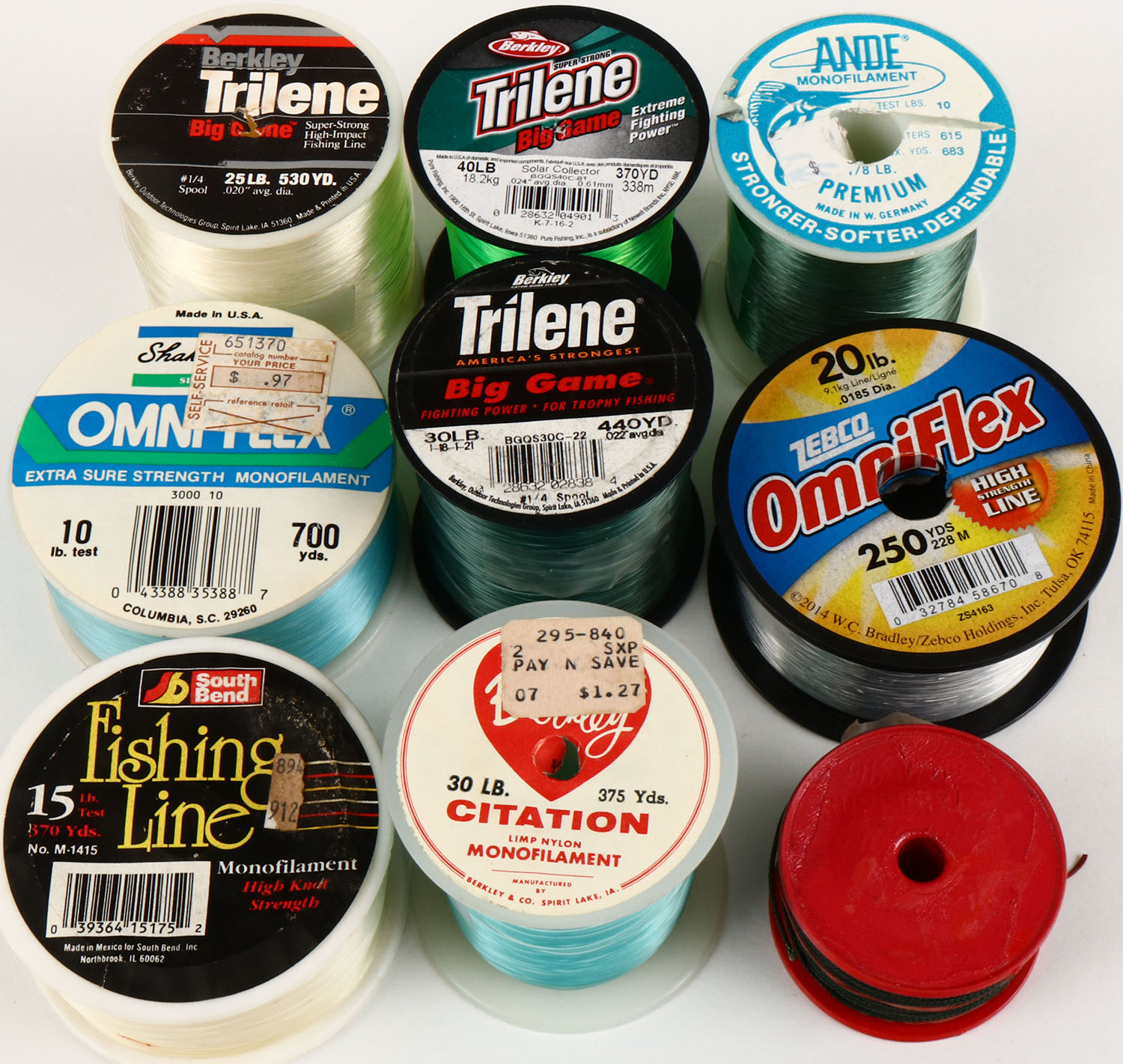 Large lot of modern fishing line on spools. Grade: Excellent - Value: 10 to 60