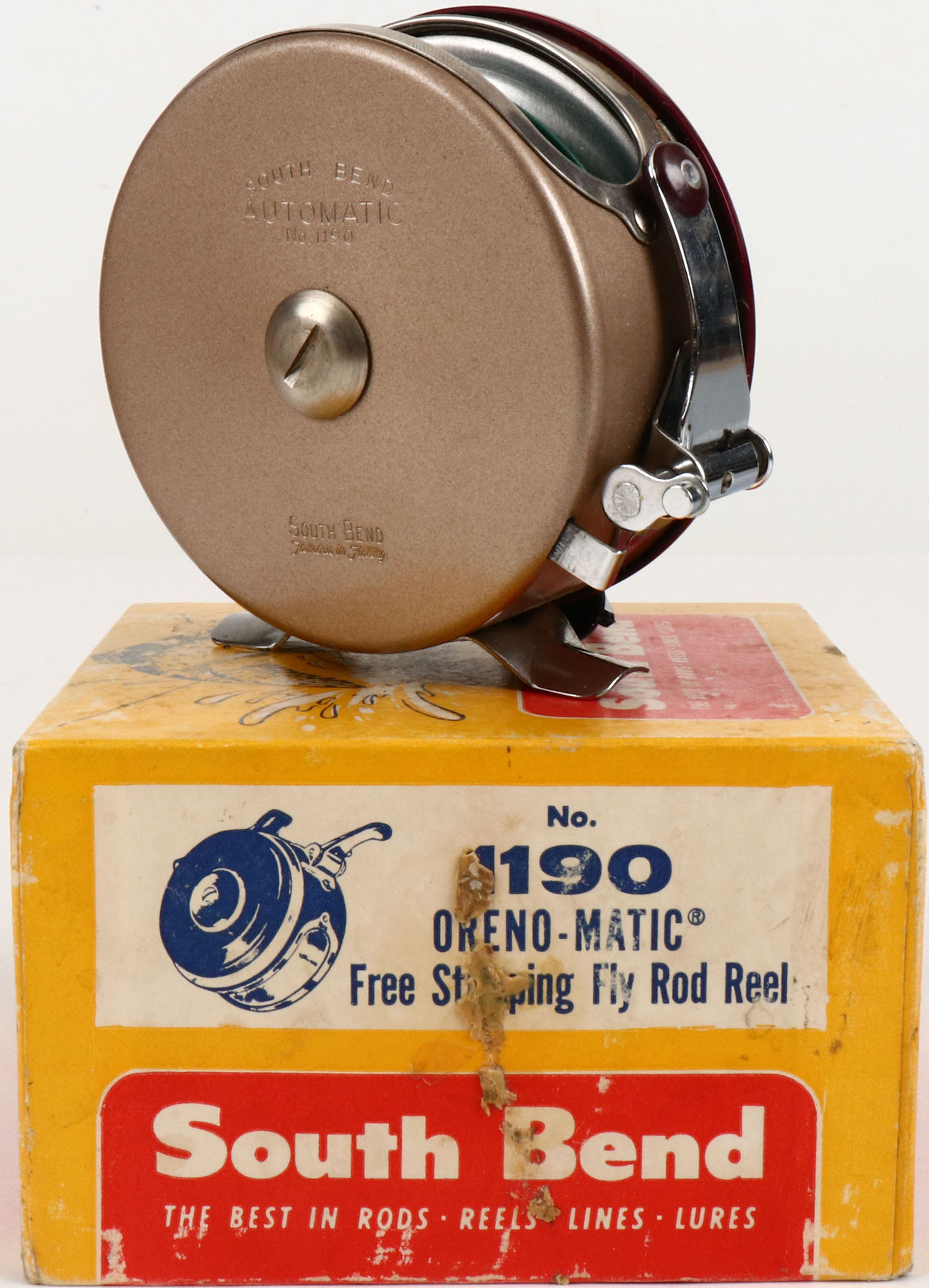 South Bend Oreno-Matic, No 1190 Auto Fly Reel in the original box, has paperwork. Grade: Excellent - Value: 10 to 50