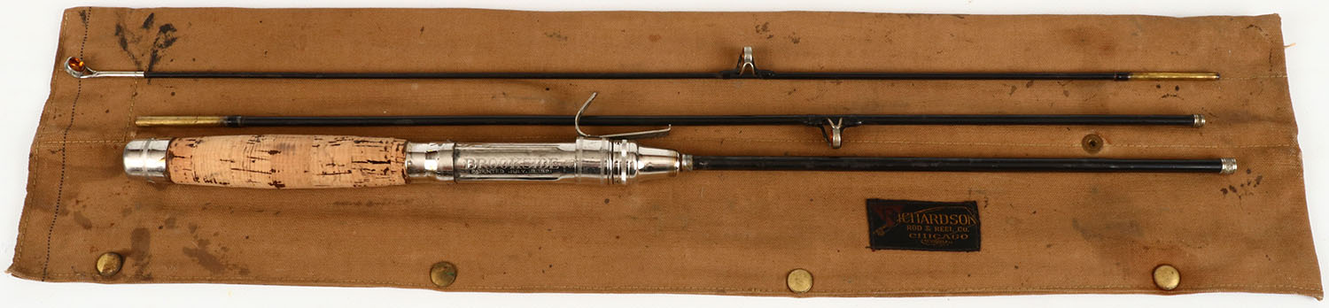 Richardson Steel Rod, Chicago, BROOK SIDE, well marked on reel seat & canvas bag, 5', 3pc., 1 tip, all guide have amber agate guides, cork handle is very nice. Grade: Excellent - Value: 10 to 60
