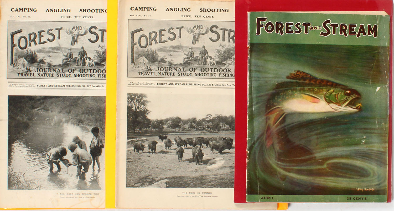 Lot of 3 Forest and Stream Magazines, 1908, 9 1/2'' x 12 1/4''. Preserved in plastic on cardboard, staple binding tight, minor creasing. Grade: Excellent + - Value: 2 to 100