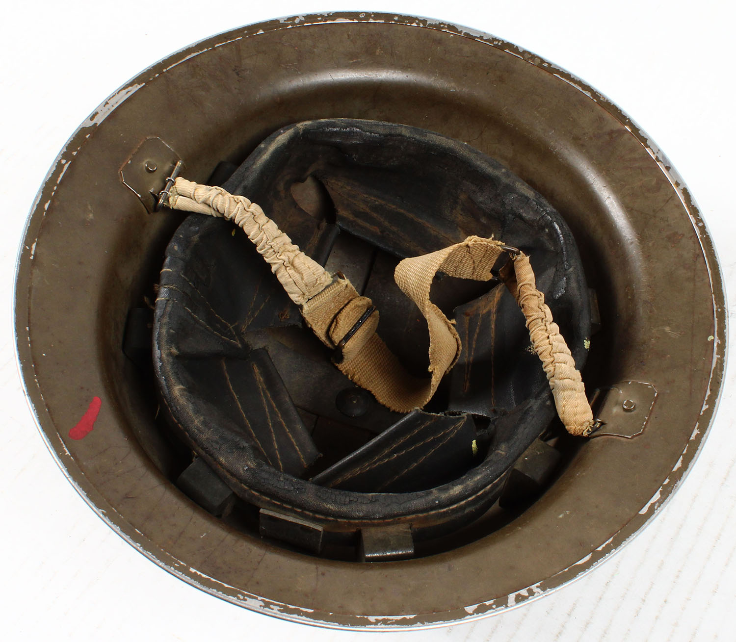 Canadian, WW2 MK II Brodie Helmet, Marked ''C.L./C. 1941'', Helmet has small dents on top, scratches, chips around rim, wear, liner leather has wear from age/use, & Paint Marks. Grade: Very Good + - Value: 20 to 100