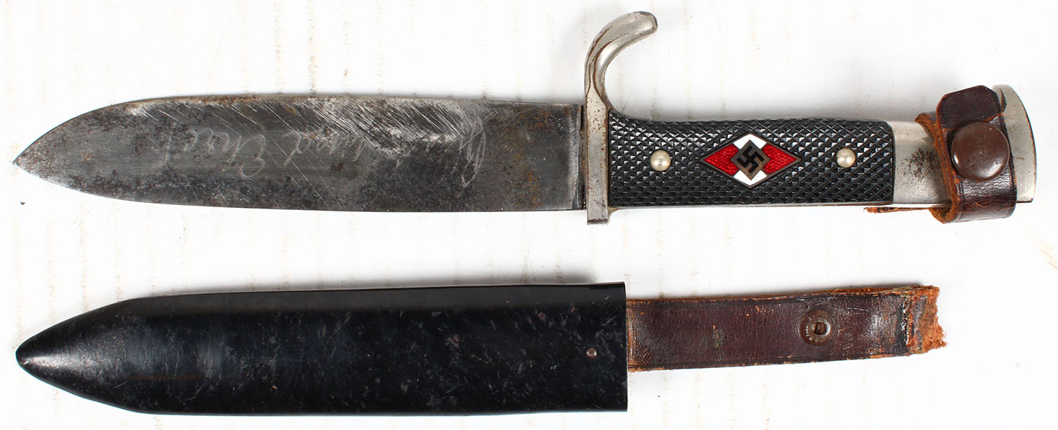 German, Hitler Youth Knife, handle marked with small red/white enamel badge with Swastika, Blade marked with Two Bottles inside circle, ''CARL HEIDELBERG SOLINGEN'', ''GES.GESCH.'', leather on holster has been torn. Grade: Very Good + - Value: 60 to 240