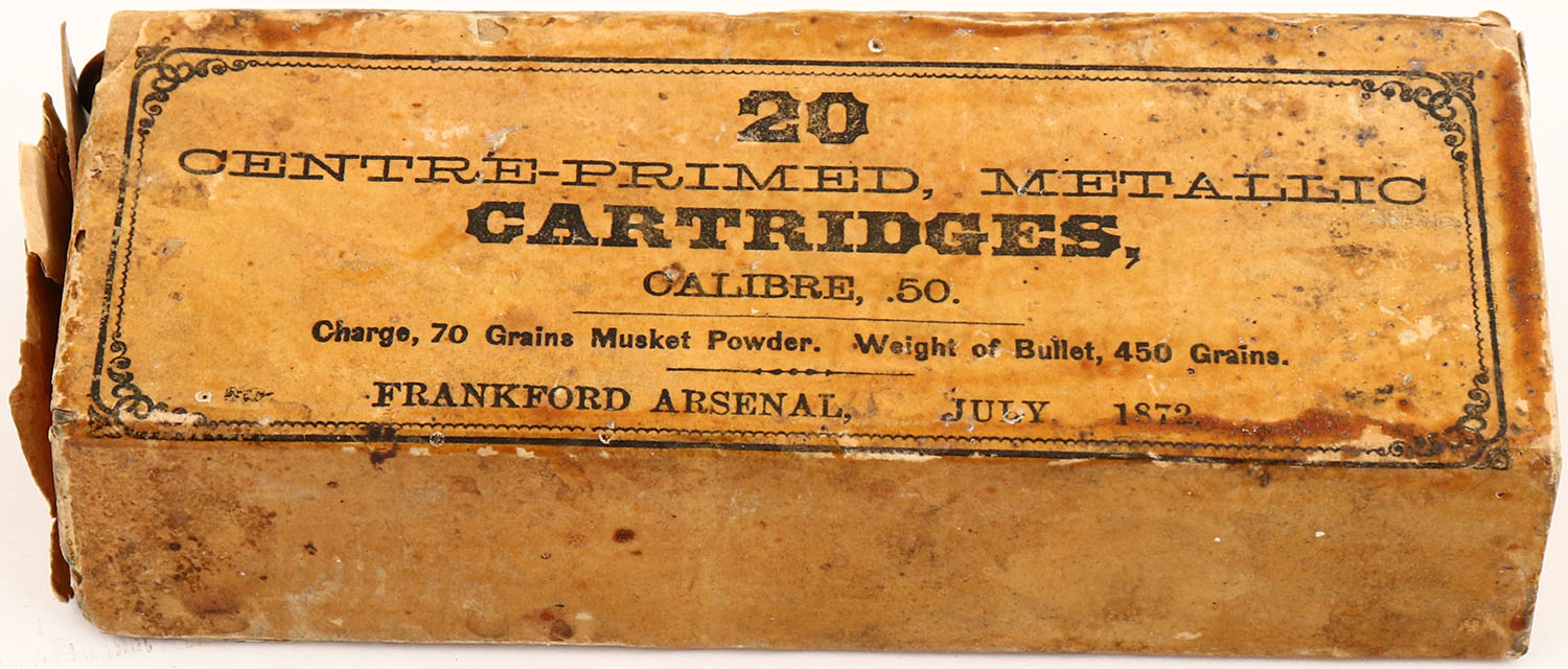 Frankford Arsenal, .50 Calibre, 70 Grs. Musket Powder, 450 Gr. Bullet, 1pc, Full, buff box & label with black print, box is solid with left end flap replacement, age soiling, rub wear & edge wear, ammo is very good. (1104) Grade: Very Good ++ - Value: 30 to 120